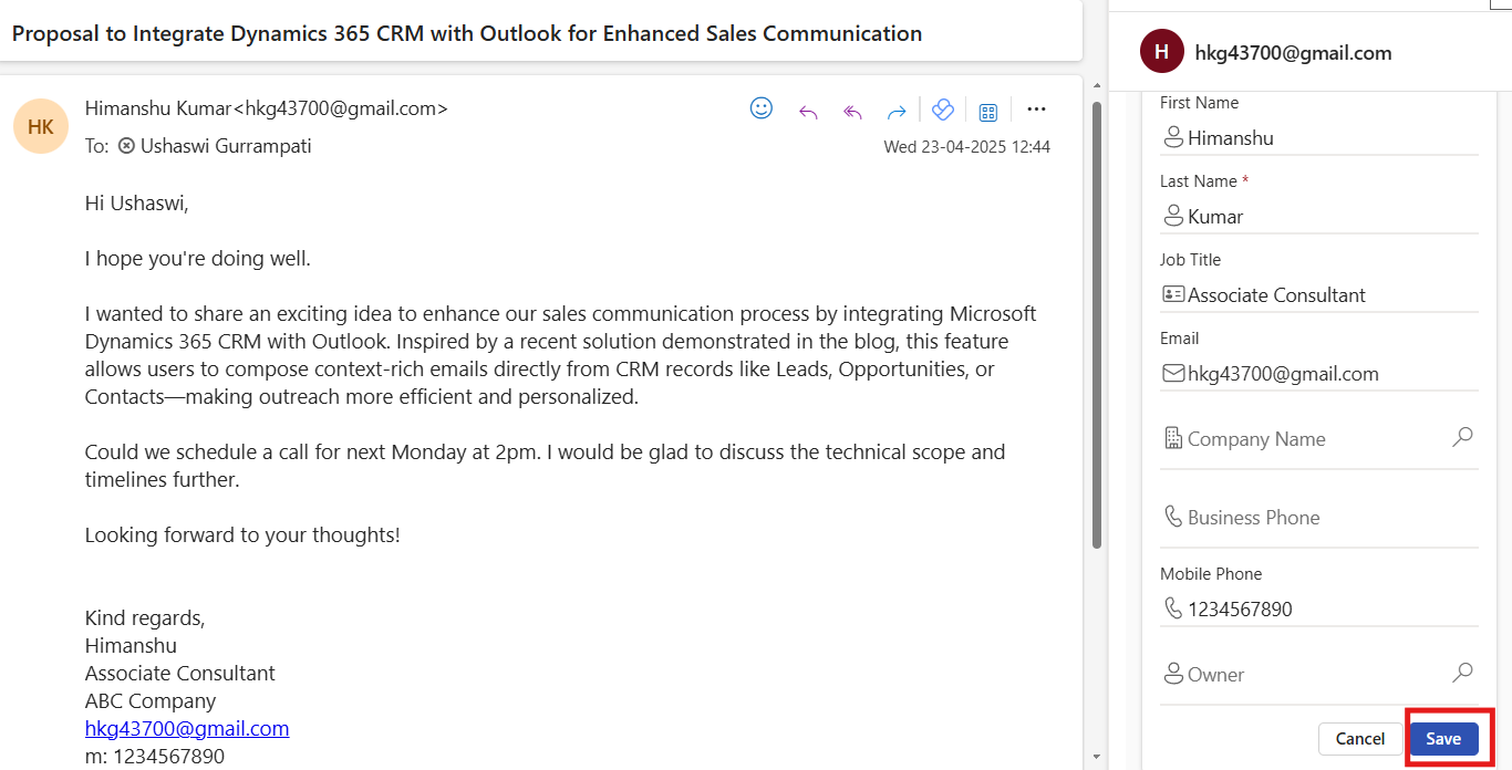 Click Copilot for Sales. You’ll get options to: a)Save email to Dynamics 365 b) Add contact to Dynamics 365