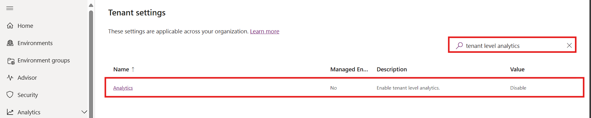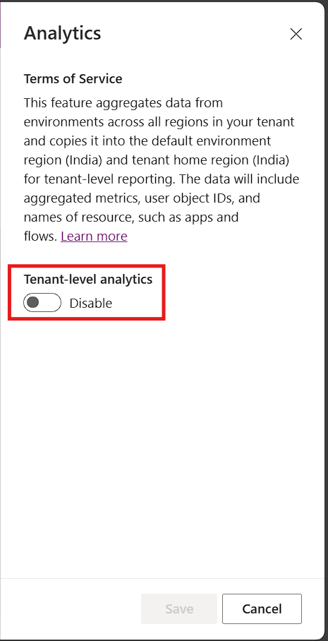 Here, you can see Tenant level analytics is disabled.