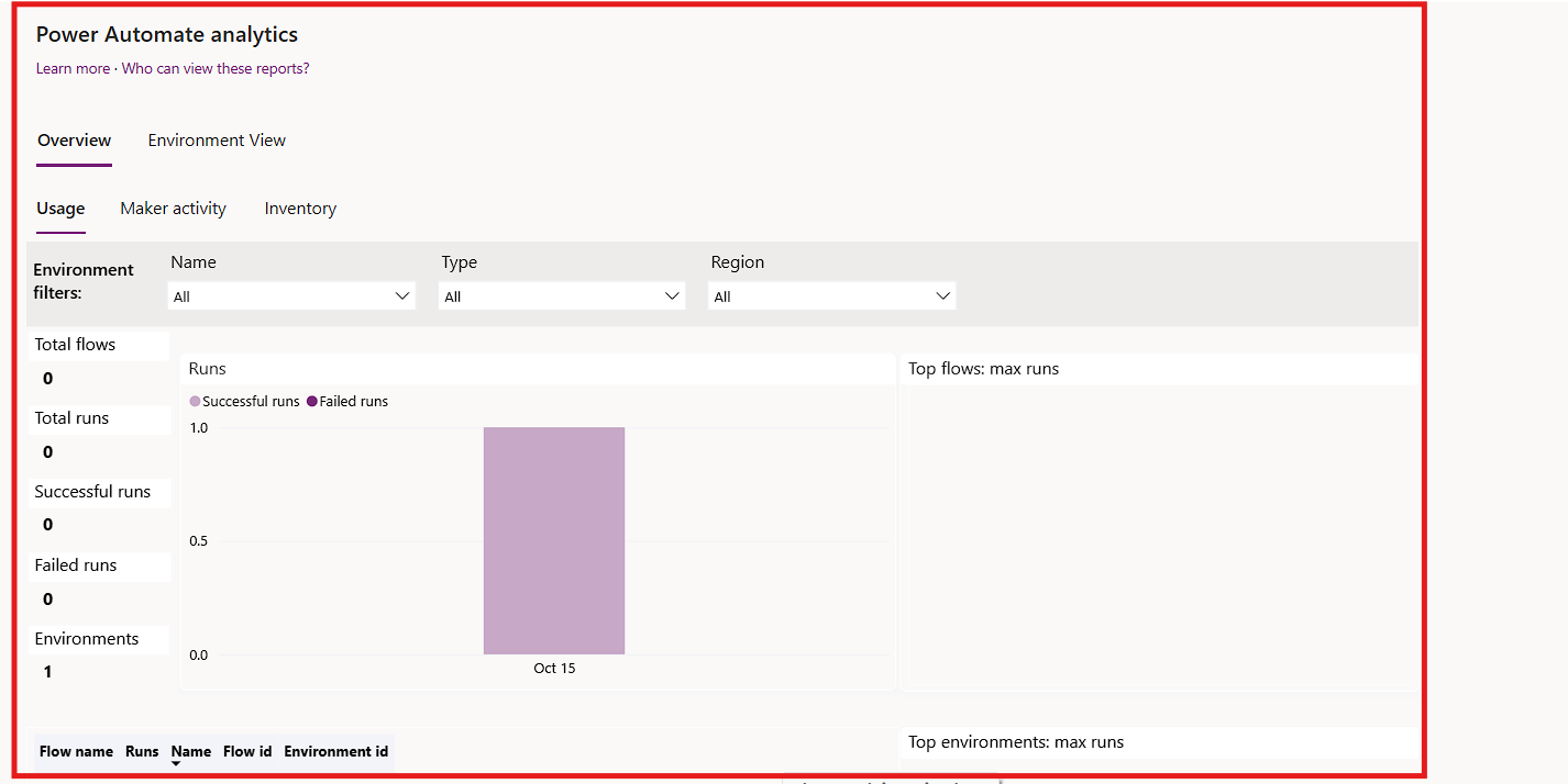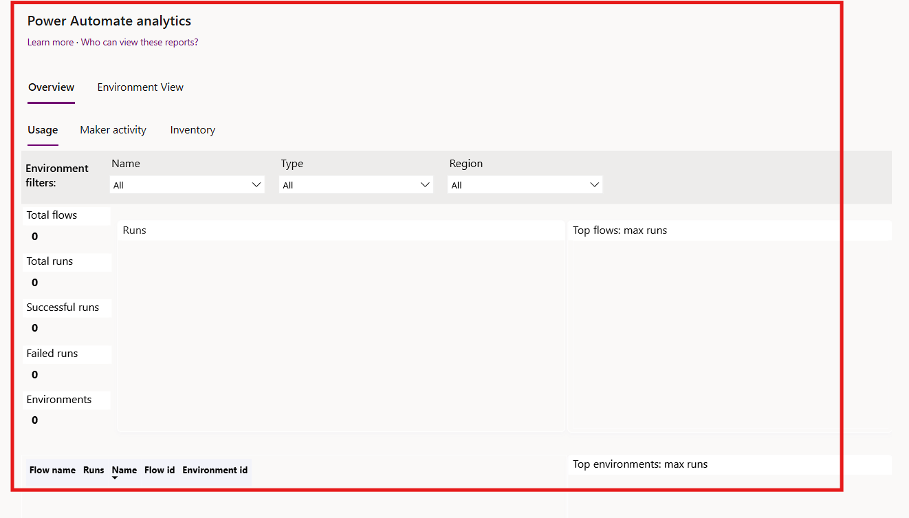 When you return to the Power Automate or Power Apps section under Analytics, it will display that your Tenant-Level Reports are ready.