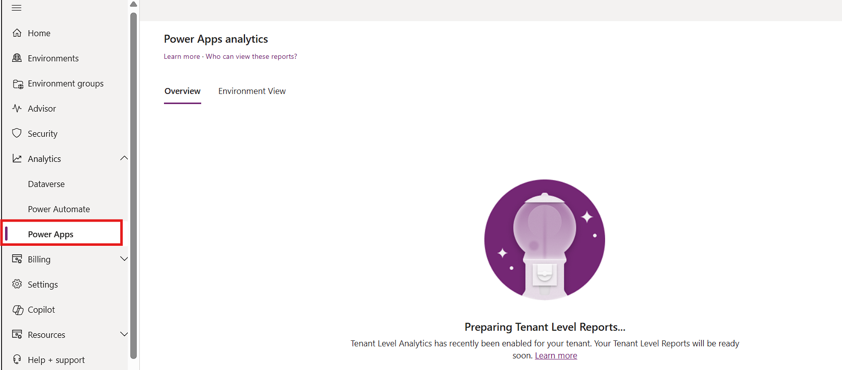 After enabling Tenant-level analytics, it may take some time for the data to populate. Users will be notified when the analytics are ready to be viewed in the Power Platform Admin Center.
