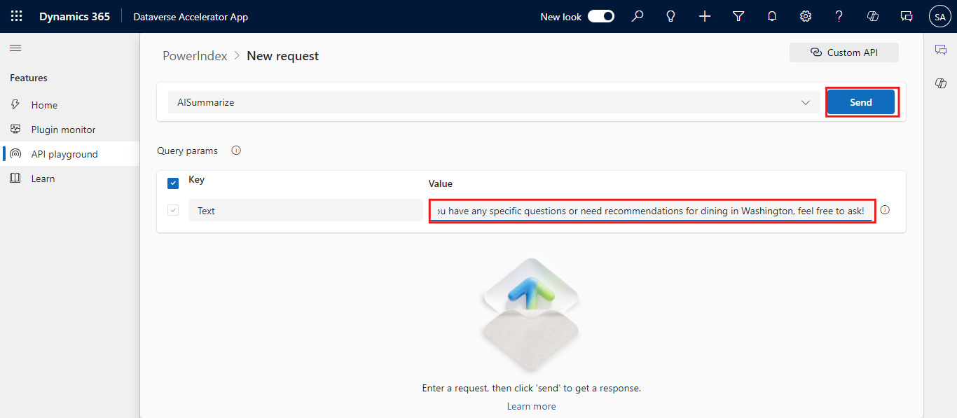 Enter sample text in the value field in the Query Params table. Click Send to execute the request.