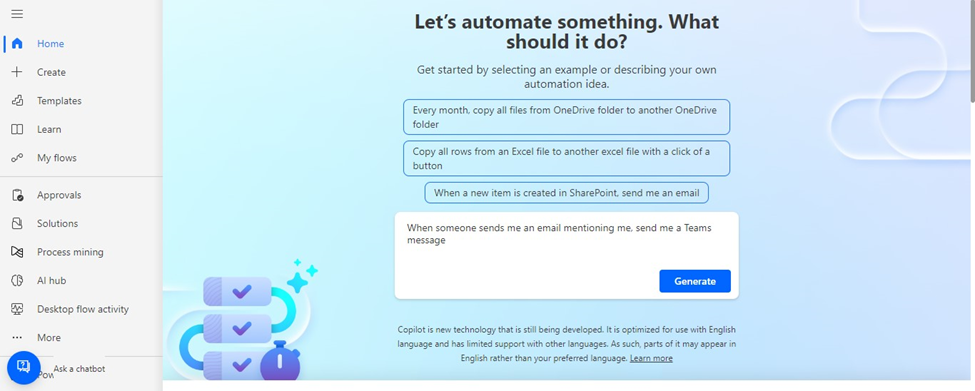 For example, describe your prompt to the copilot like “When someone sends me an email mentioning me, send me a Teams message.” and the flow is generated based on the prompt that is given.