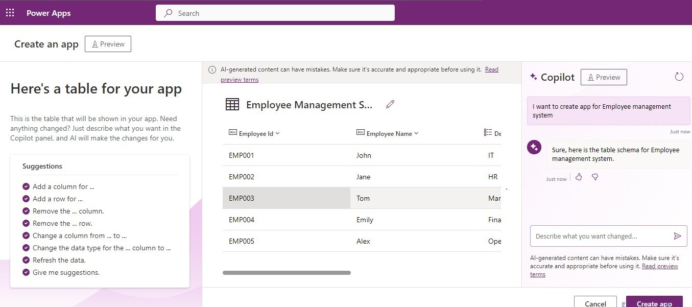The copilot in Power Apps is an AI-powered assistant that accompanies you throughout the app development journey. It utilizes generative AI and best practices to generate suggestions related to your data and preferences. Additionally, Copilot provides tips and feedback throughout the process, helping you learn how to create better apps more efficiently.