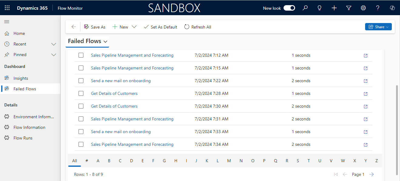 Failed Flows: Specifically focuses on flows that have failed. This section allows you to quickly identify and troubleshoot issues.