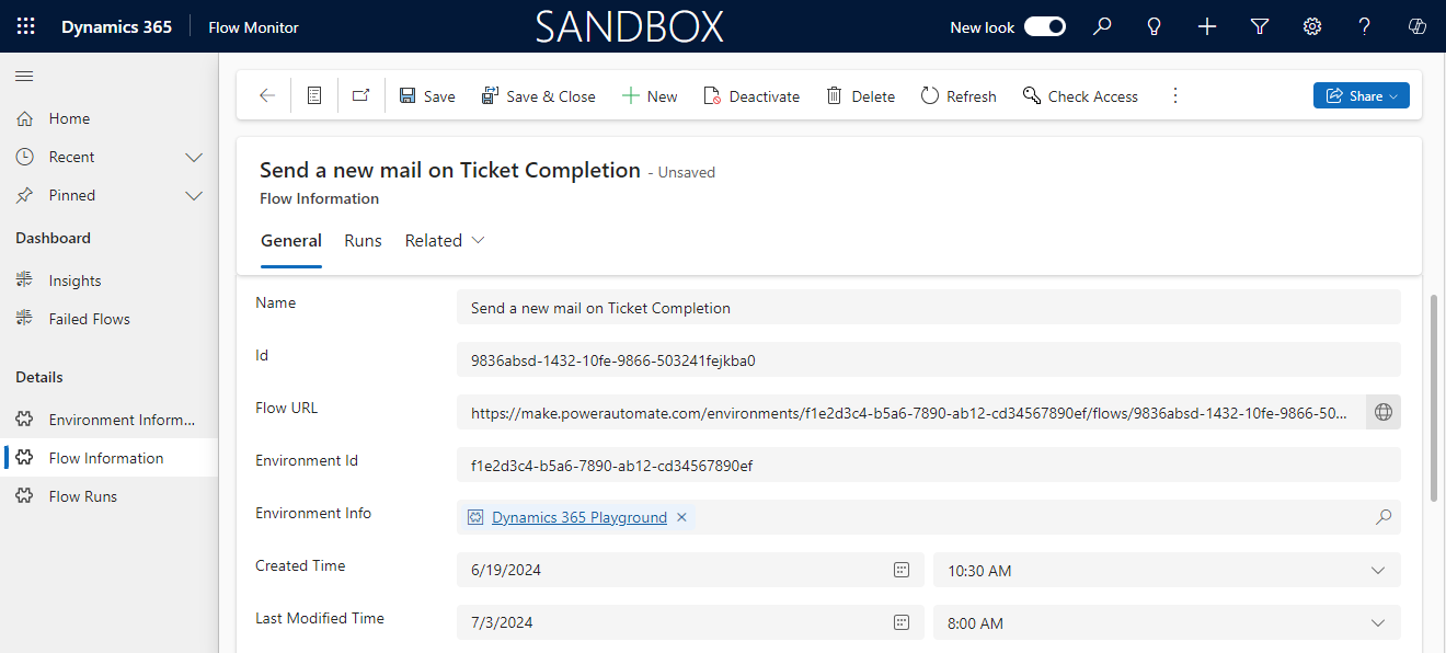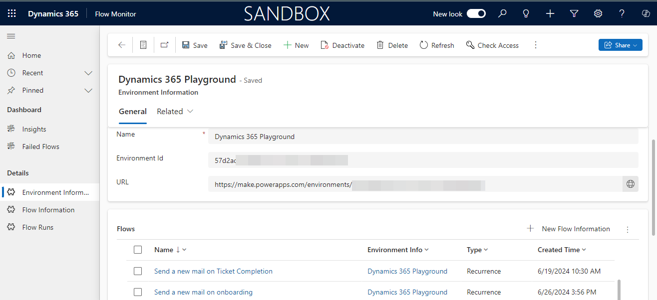 Environment Information: Contains details about the environments in the organization where your flows are running. This includes the environment name, ID, and URL.