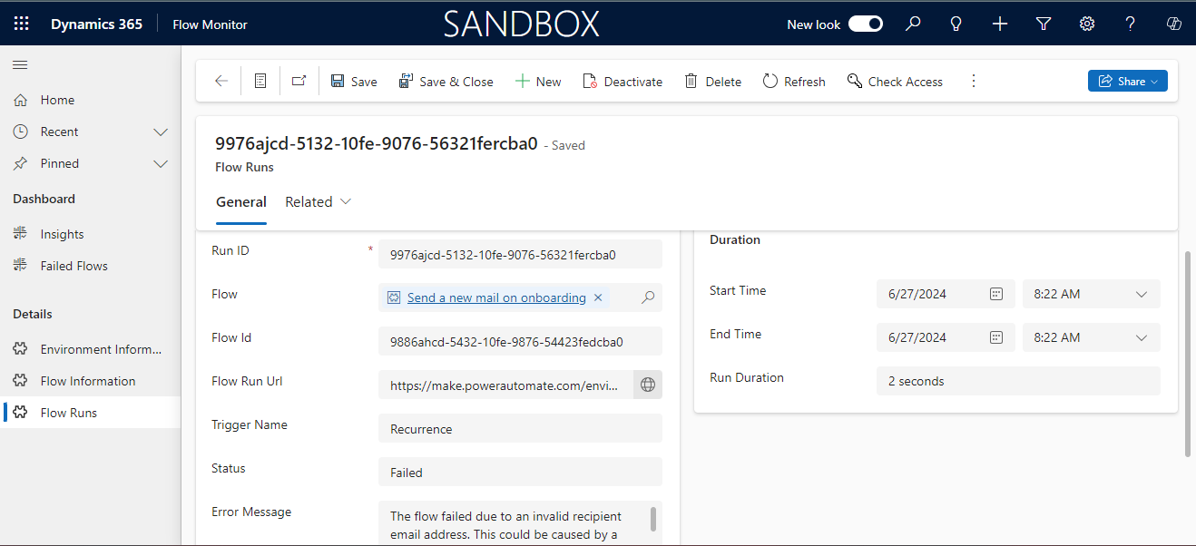 Here is an example of a failed flow run. This detailed tab is clearly labeled with run ID, flow name, and specific error messages that explain why the flow failed to help users quickly identify and resolve issues.