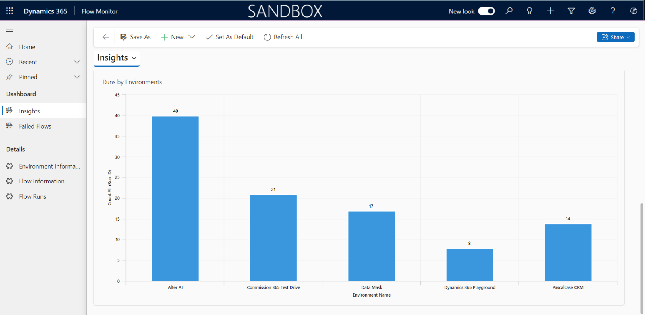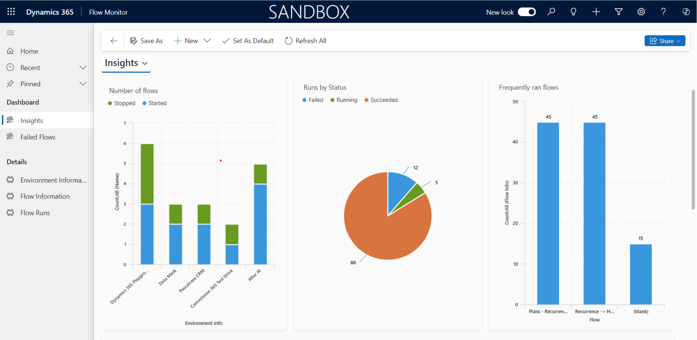 Easily analyze and review the performance and usage of flows in different environments to identify key insights.
