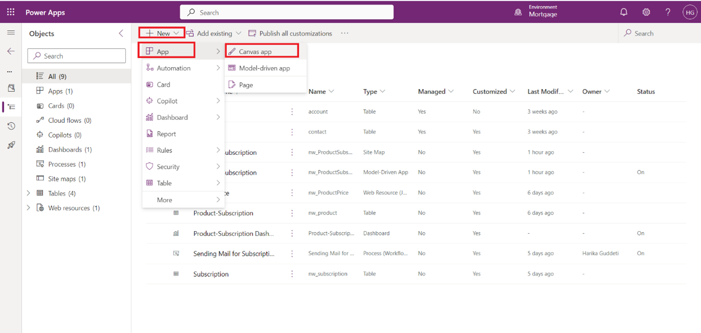 In Power Apps, click on New, select App, and then choose Canvas app to create a new canvas application.