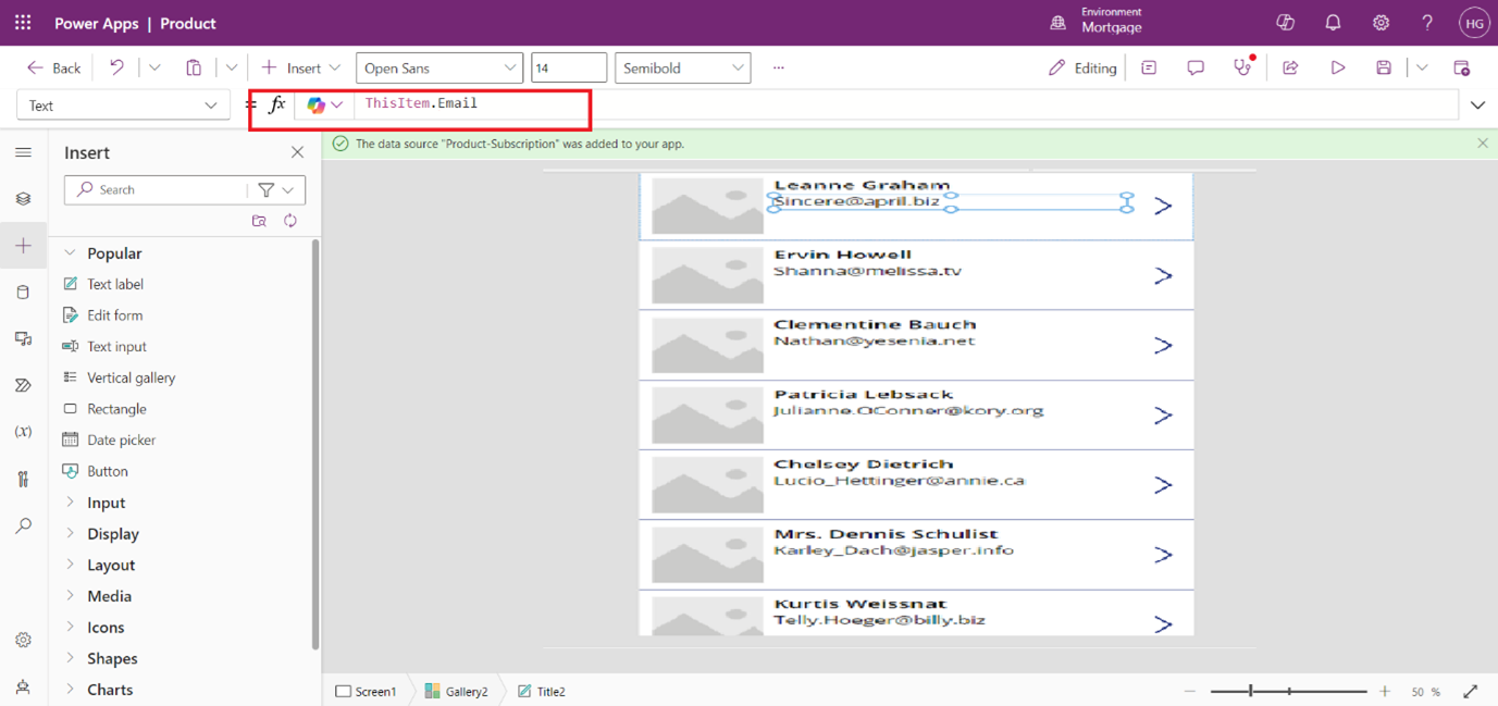 Set the gallery's data source to the API response with ThisItem.Email and edit the label formulas in the formula bar.