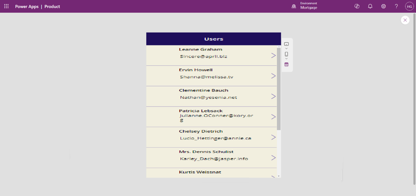 In the top right corner of Power Apps Studio, click on the Preview icon to run your app.
