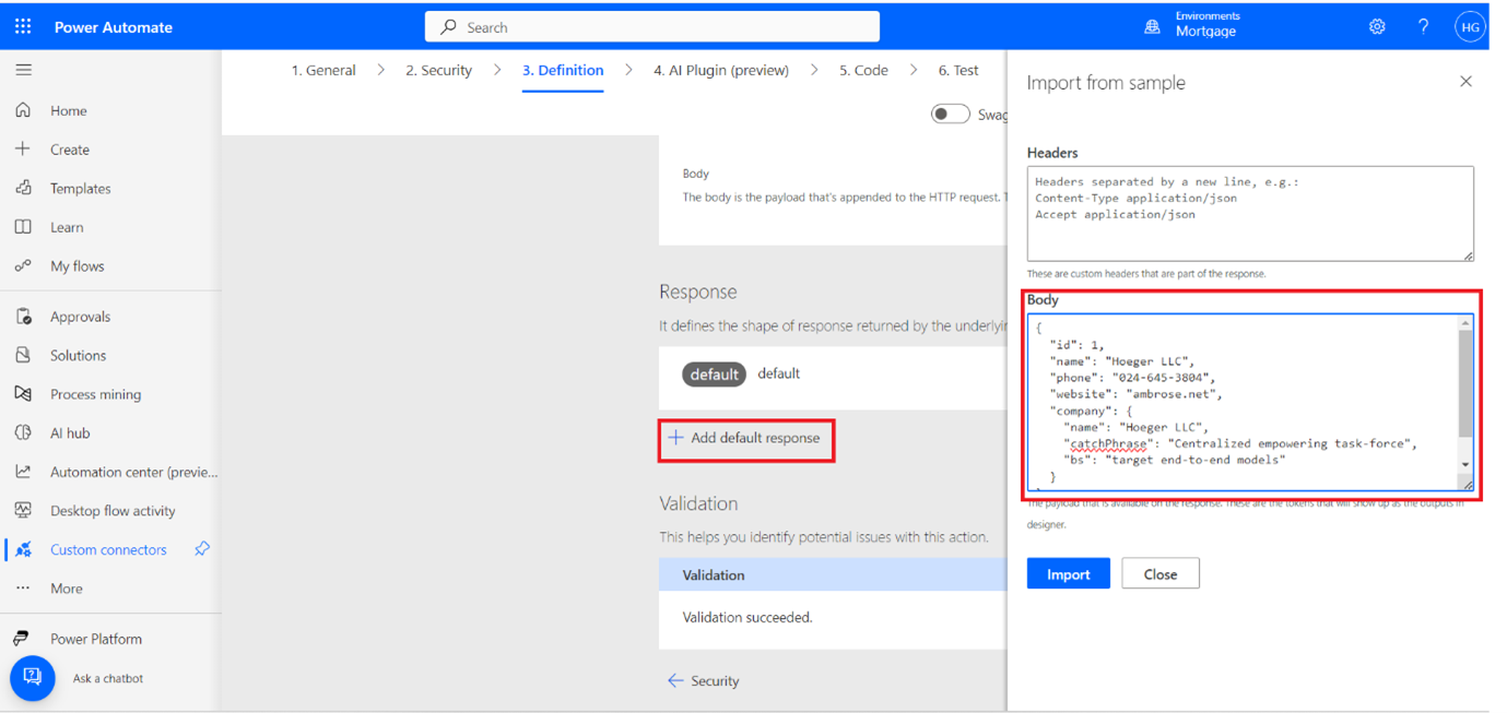 In the Response section, select Choose default response and enter the JSON response in the body.