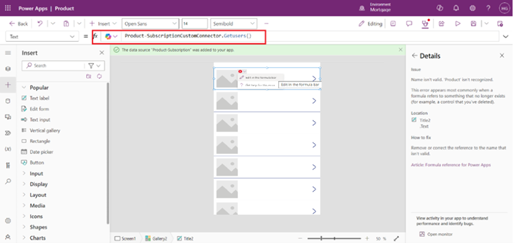 In the left pane, click on Insert, select Vertical Gallery, and then choose the custom connector as the data source.