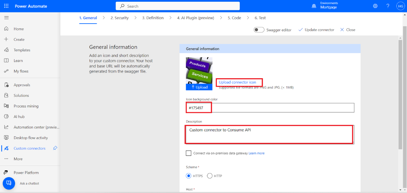 Upload an icon for the connector, select a background colour that complements the design, and add a brief description.