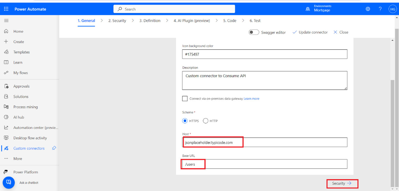 Enter the API host and base URL, then click on the Security tab to set up authentication for your connector.