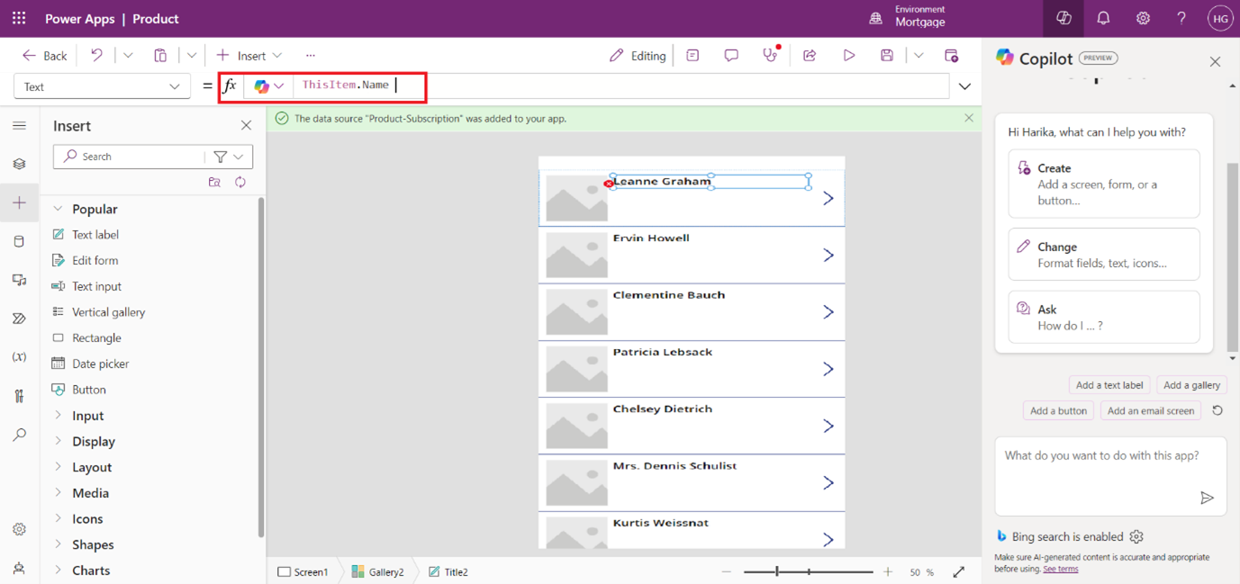 Set the gallery's data source to the API response with ThisItem.Name and edit the label formulas in the formula bar.