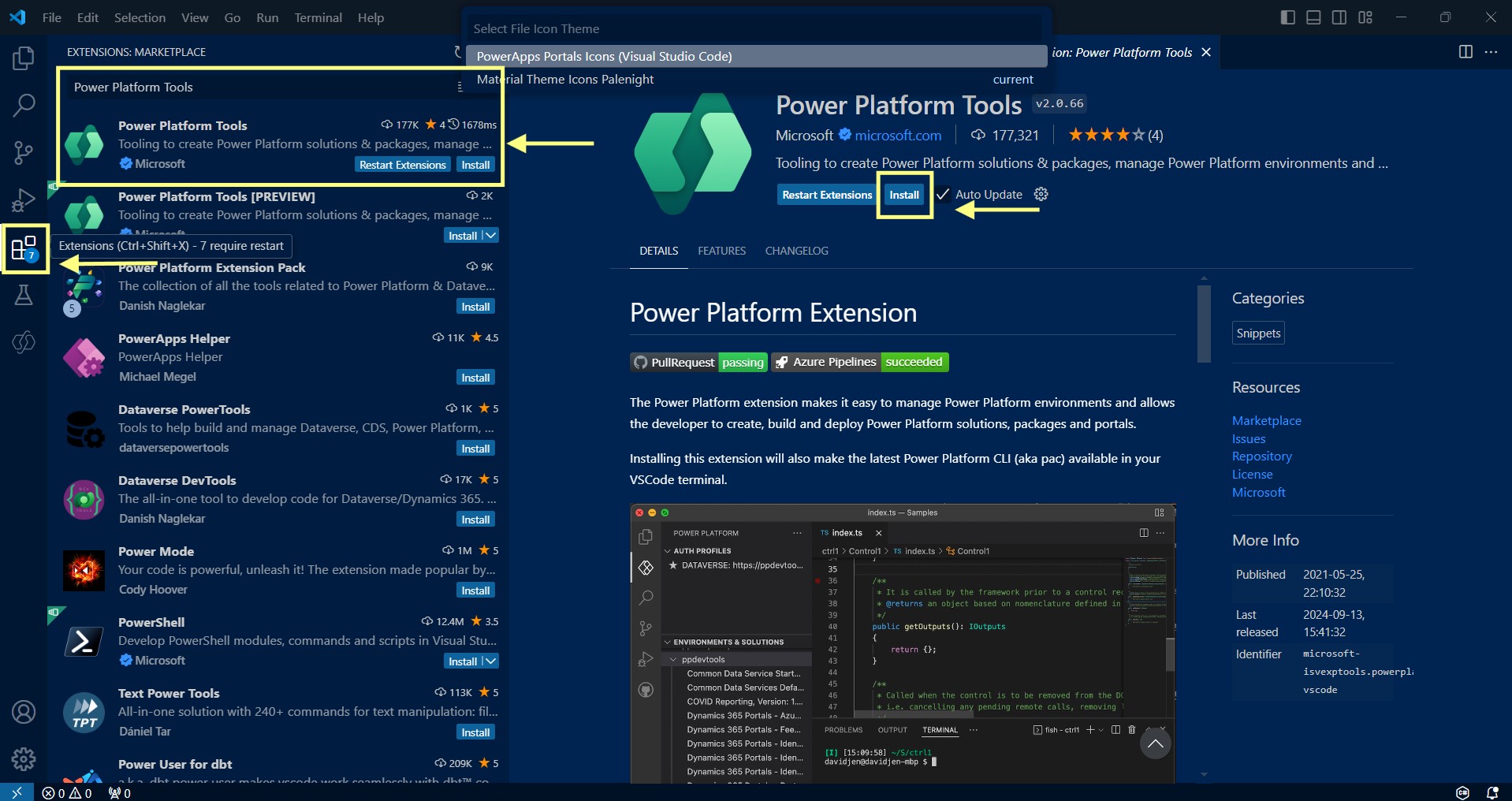 If you are using Visual Studio as your coding interface, go to extensions > Search for “Power Platform Tools” and Install it.