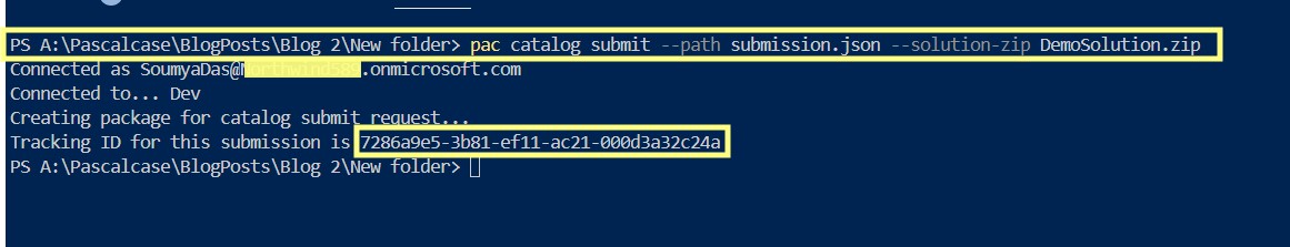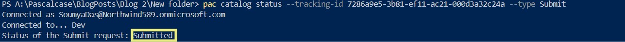 g. You will be able to track the status of your submission with the command: pac catalog status --tracking-id <enter the id> --type Submit.