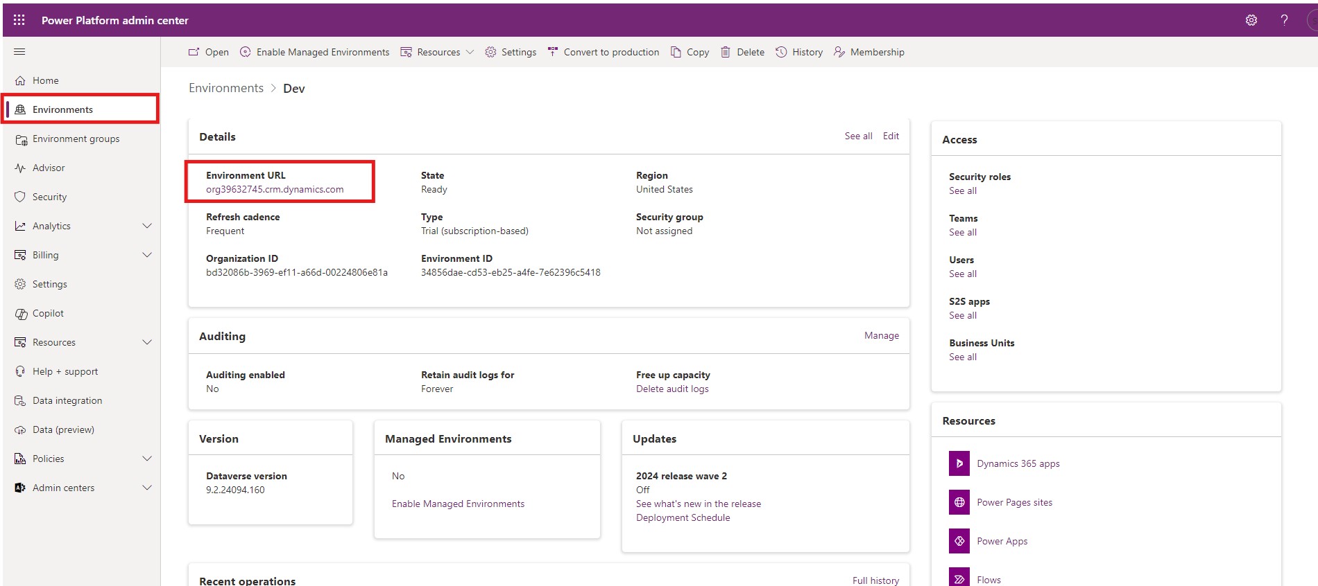 To find the url of your environment, go to admin.powerplatform.microsoft.com > Environments > Click on your environment > Copy the url.