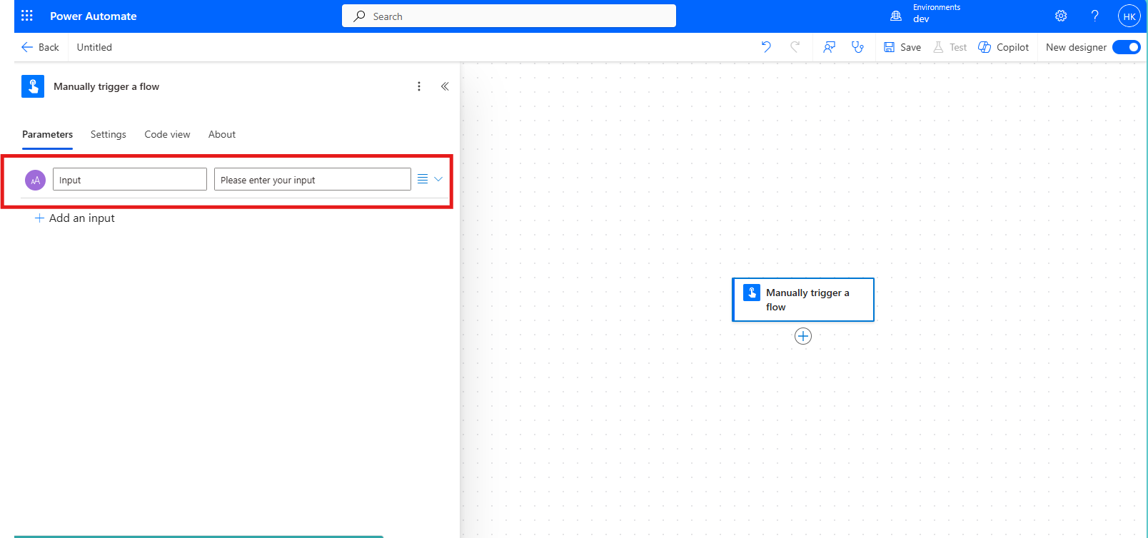 Navigate to the flow designer page and add a new action, “Manually Trigger a Flow.”