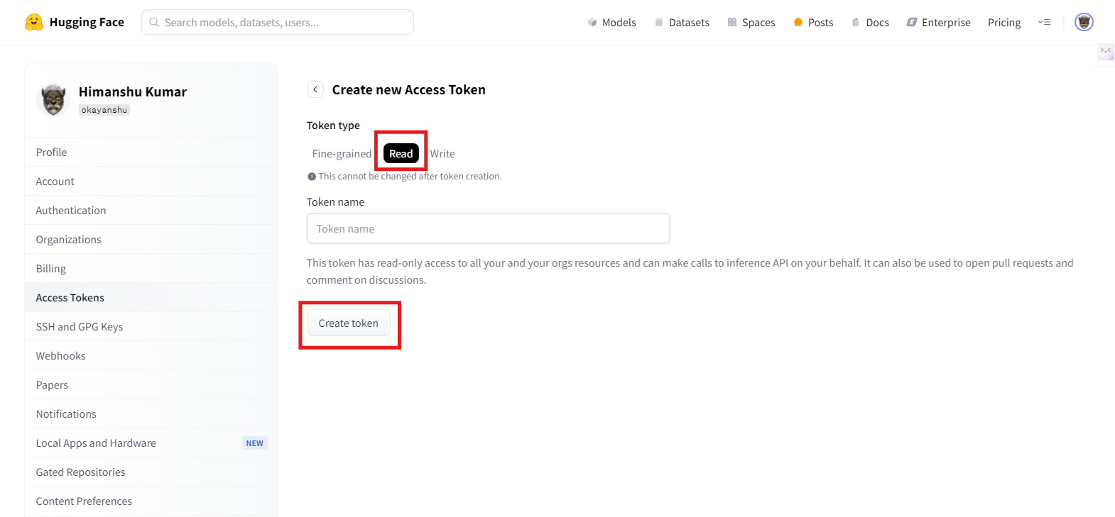 Choose token type as read (because we are using this model only for text generation). Enter a token name to identify this in the future then, click on Create Token.