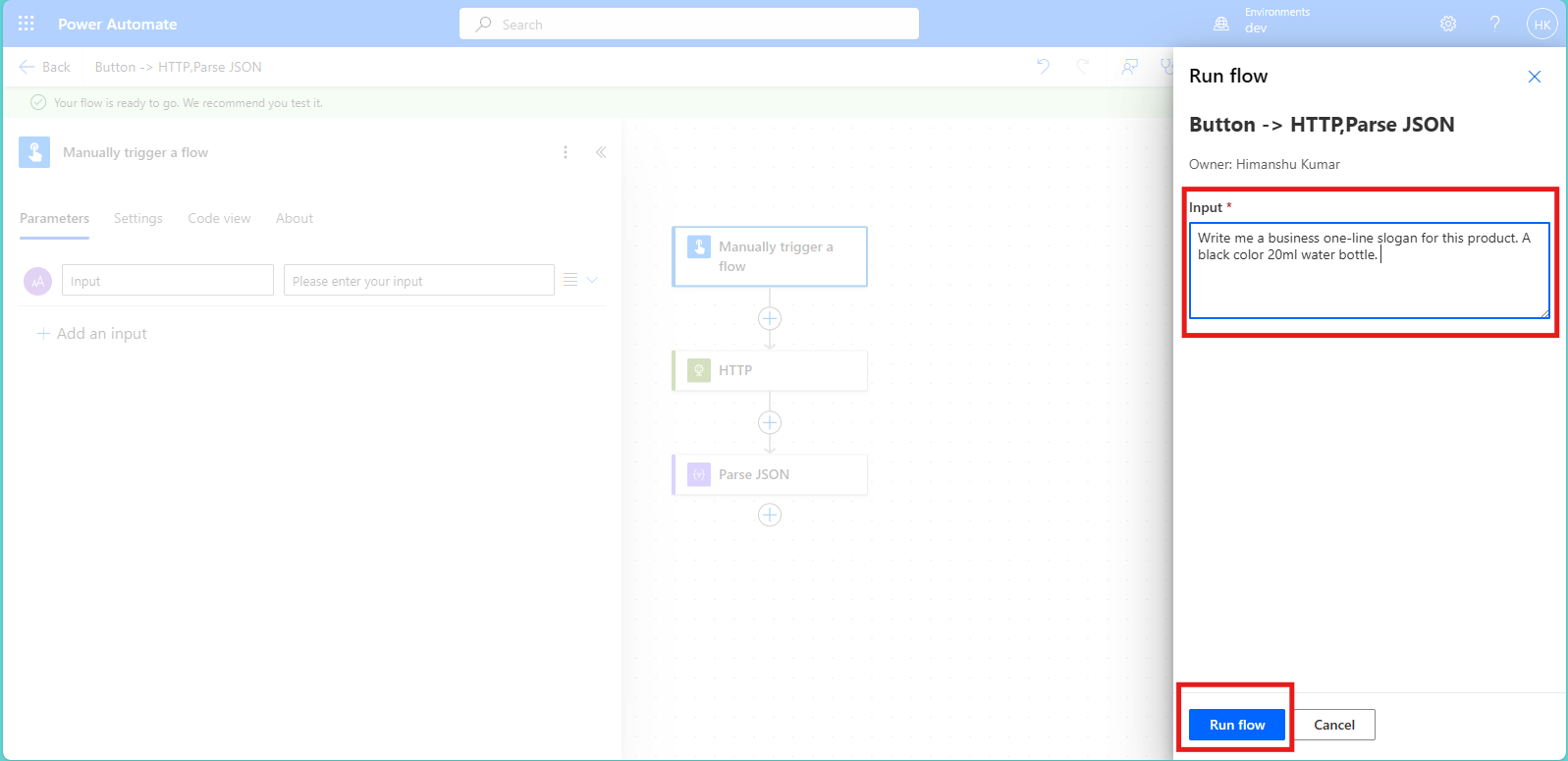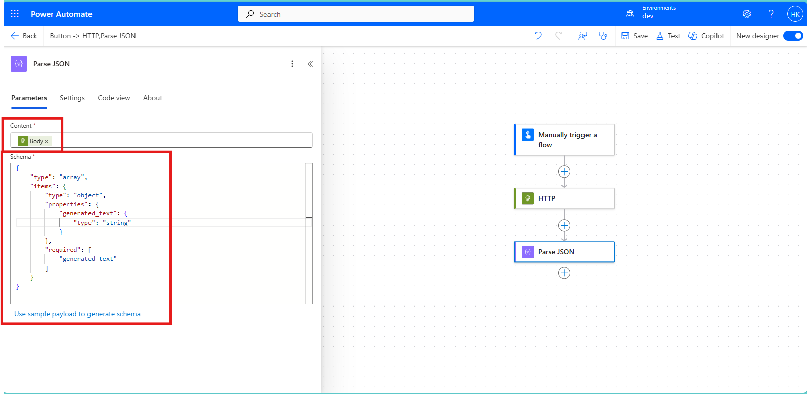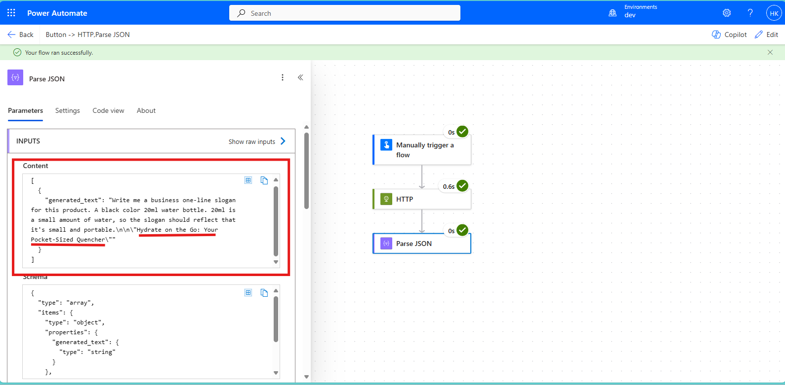 Once this flow is complete, the AI-generated text will appear in the content of the Parse JSON action.