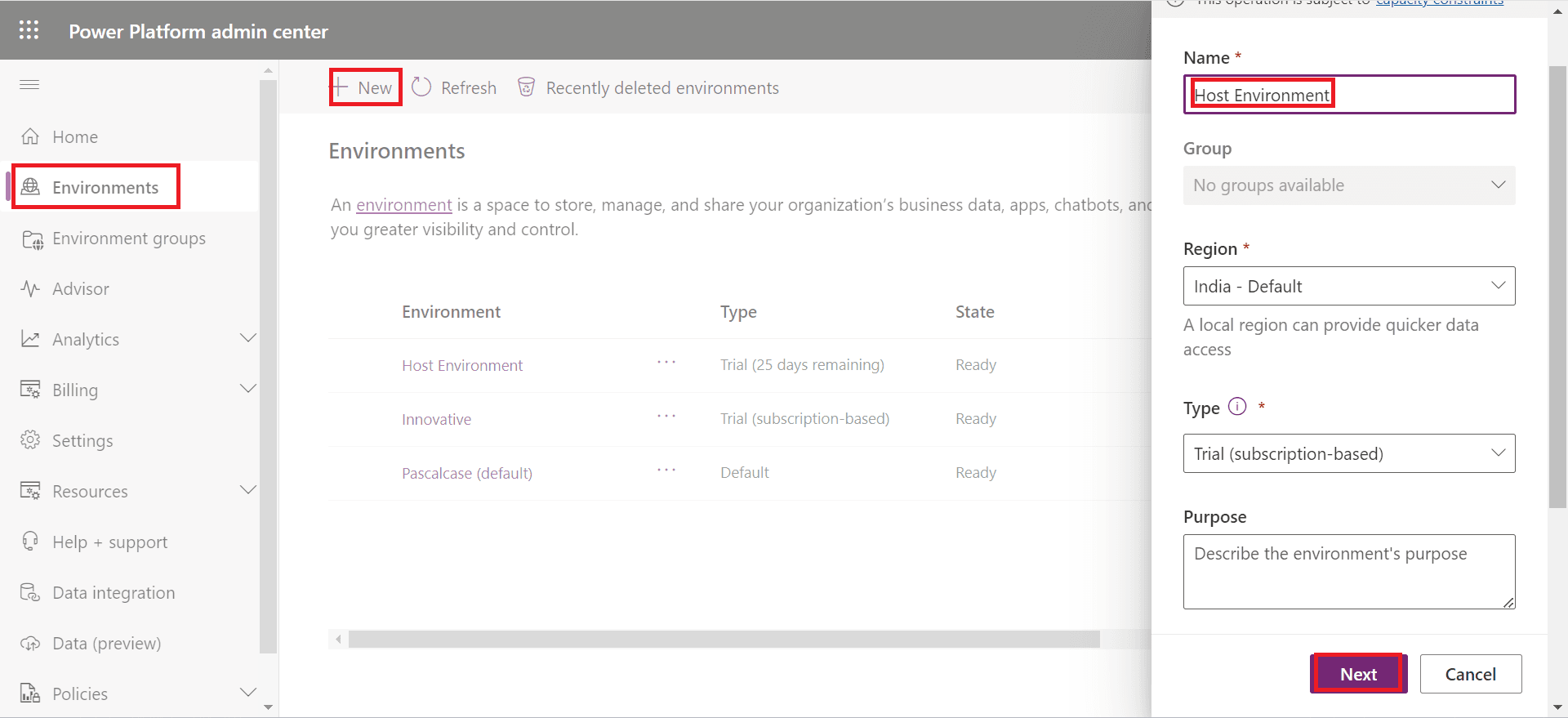 Settings > admin center > environment > new