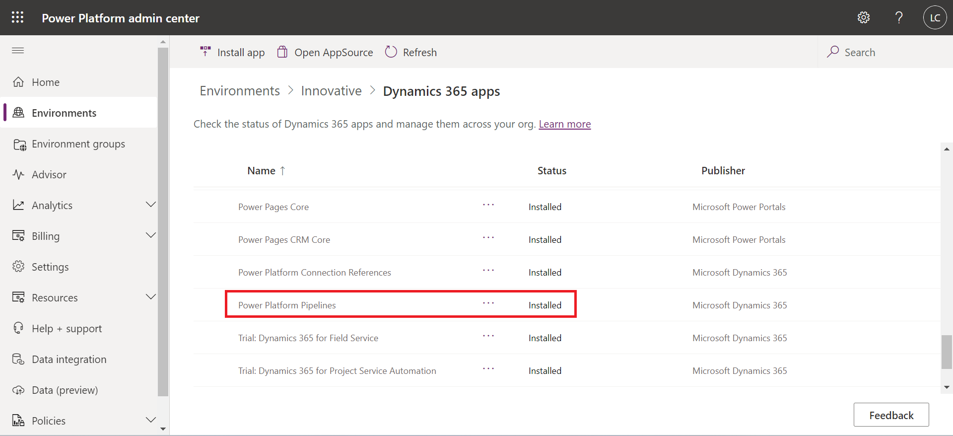 Once you are in, click on the Install app and search for Power Platform Pipelines.