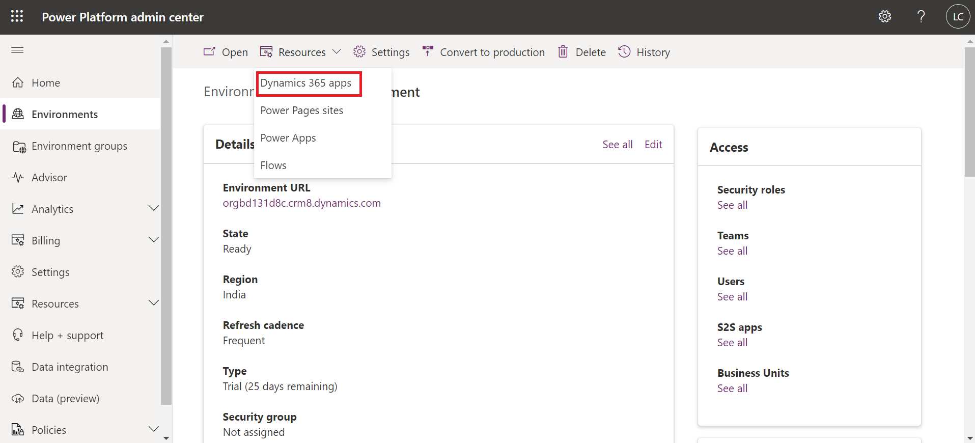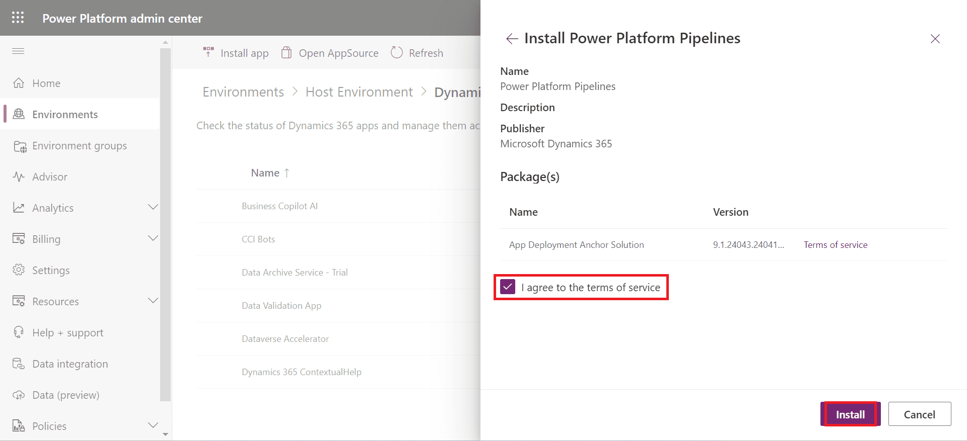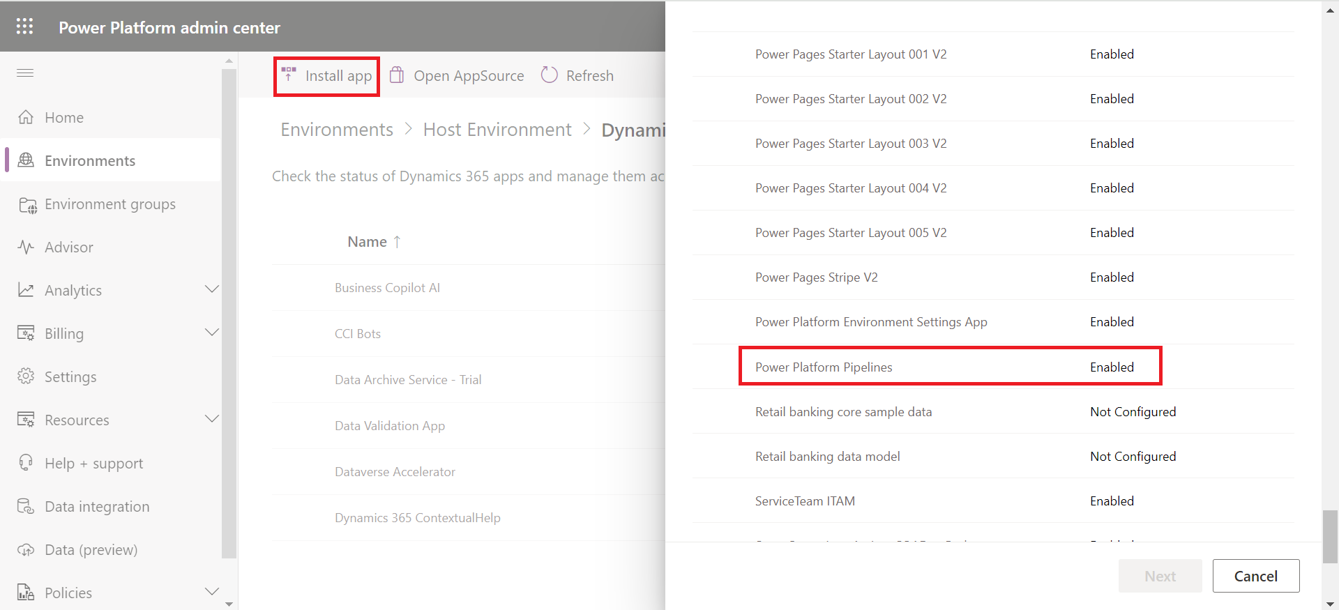 Choose a Host Environment designated to store all essential data for Pipelines. Then, navigate to its Dynamics 365 Apps section under Resources to install Power Platform Pipelines into that environment.
