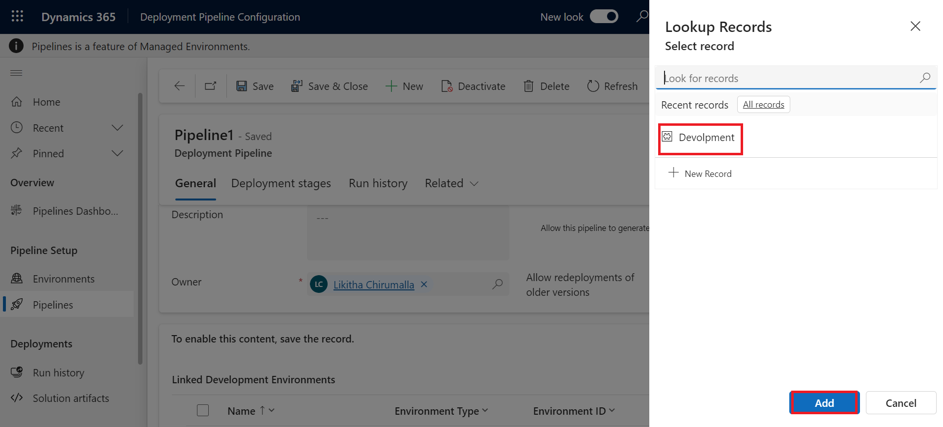 Step 3: Create a Pipeline and add a development environment:
