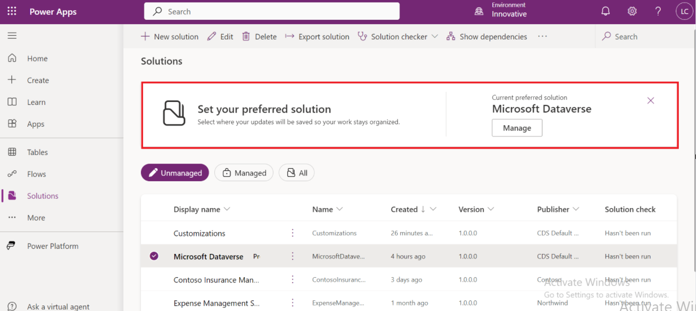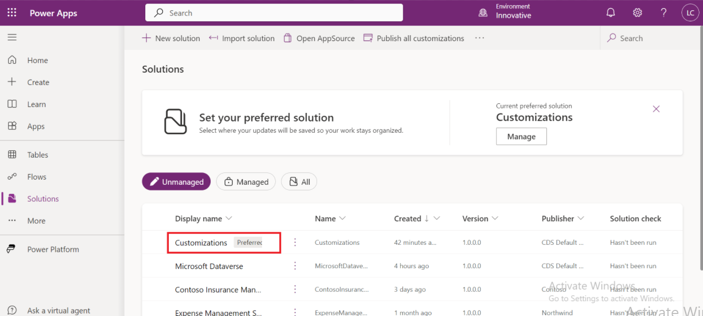 Click on the settings and select Set preferred solution or go to the Solutions and Select an unmanaged solution that you want to make your preferred solution.