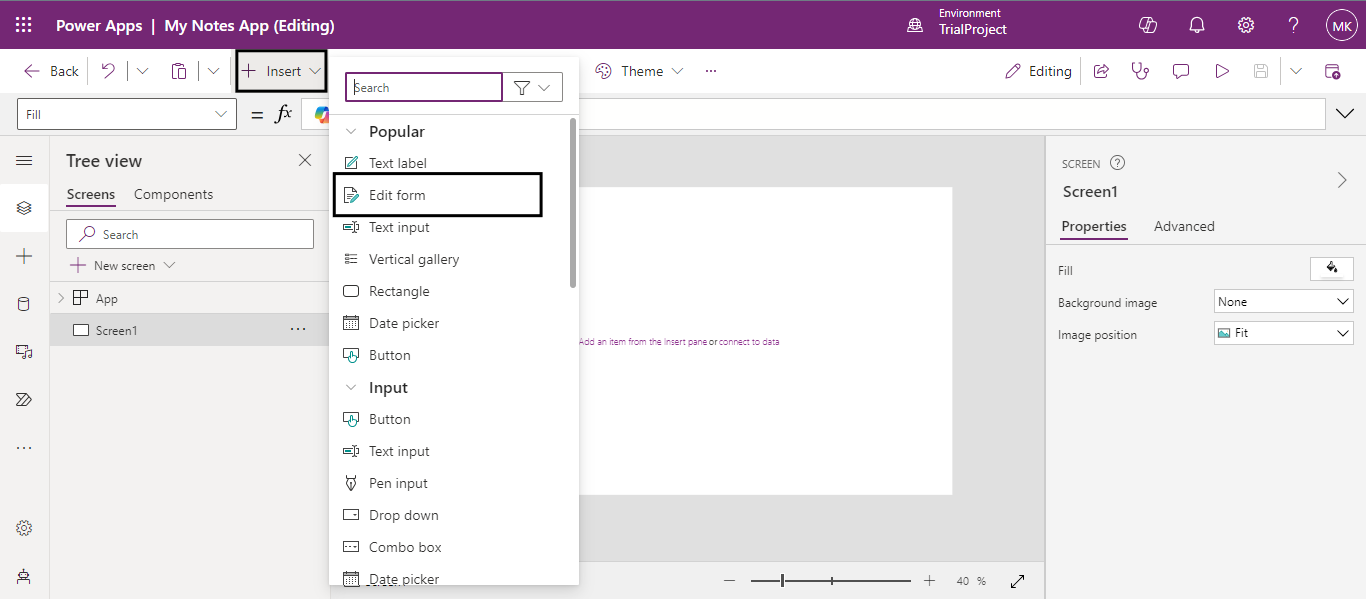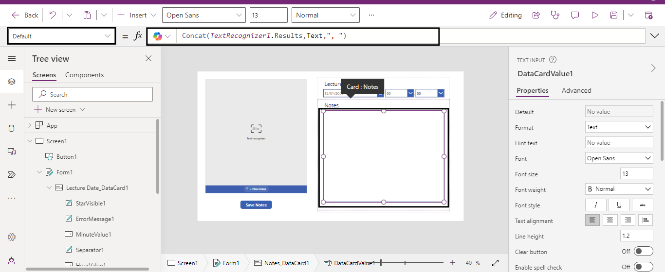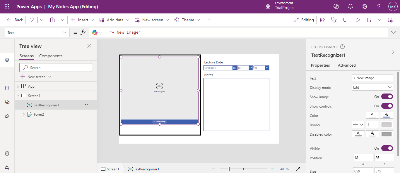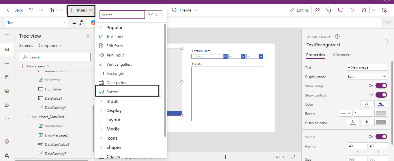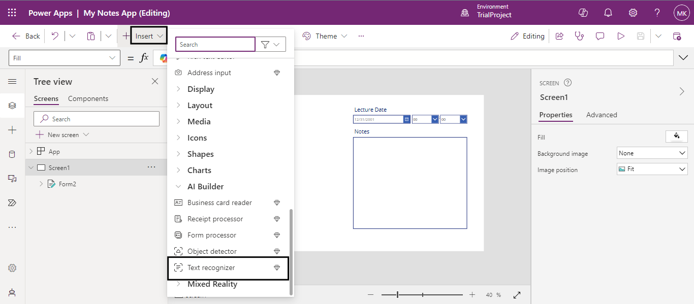 Now click on Insert and select the AI builder component ‘Text recognizer’