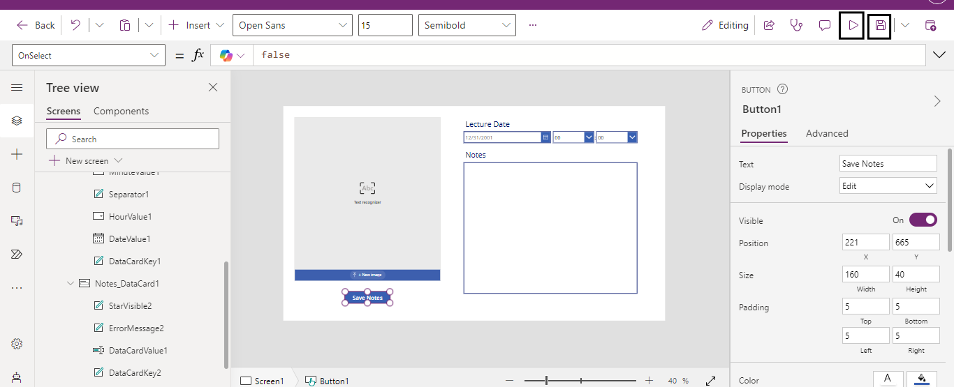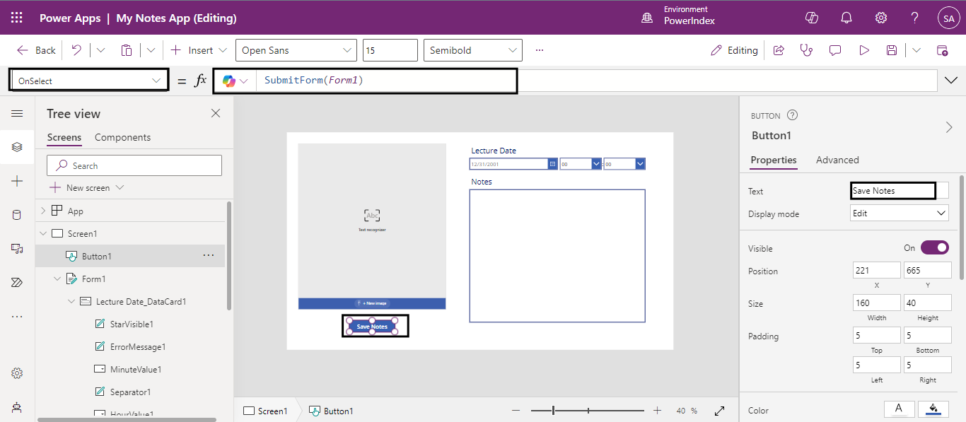 Label the button as ‘Save Notes’. Configure the button’s OnSelect property to ‘SubmitForm(form_name)’ to save the form data to the data source when the button is clicked.