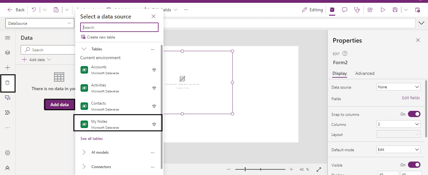 Click on the database icon on the left-side menu to add data and select the table as data source.
