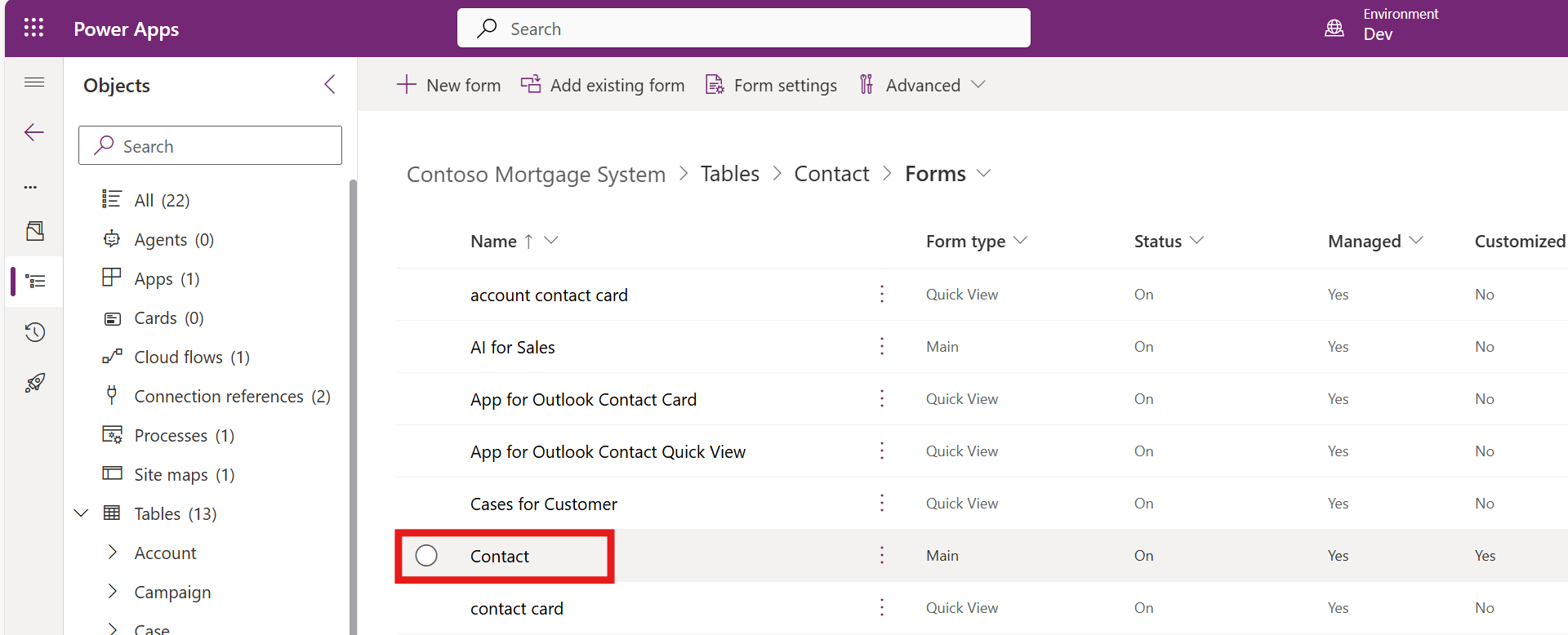 Go to the Power Apps Maker Portal and open the Main Form in the Contact entity of the respective solution.