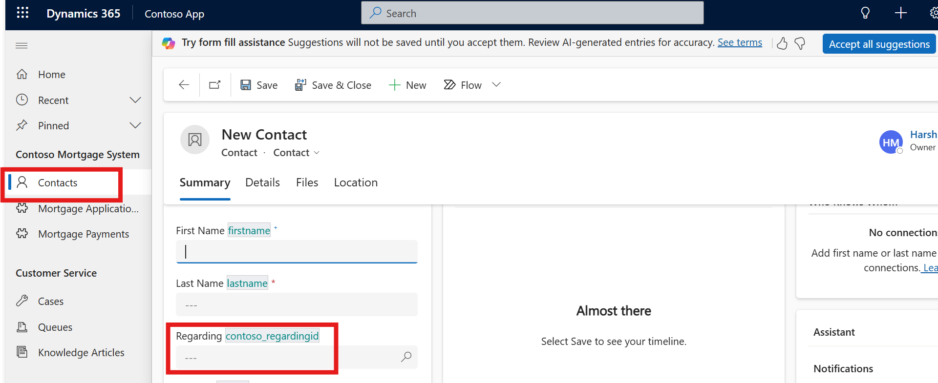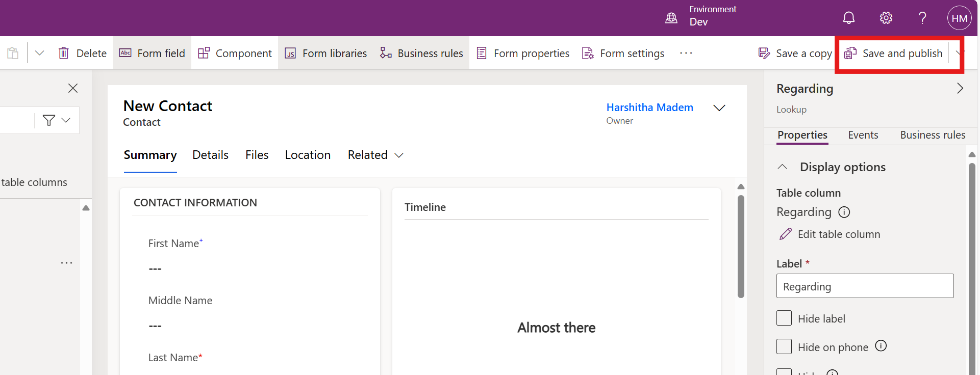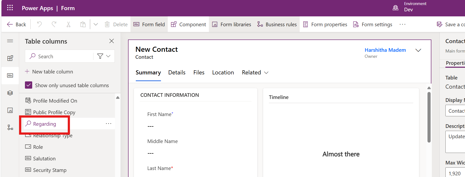 Open the User Interface in Dynamics 365 and navigate to the Contact table to find the newly created Regarding lookup field.
