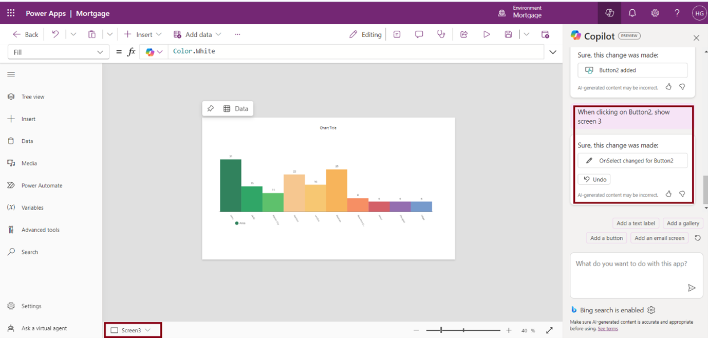 In the above image, we have added a functionality, that is clicking the button triggers Screen 3 through a Copilot command.