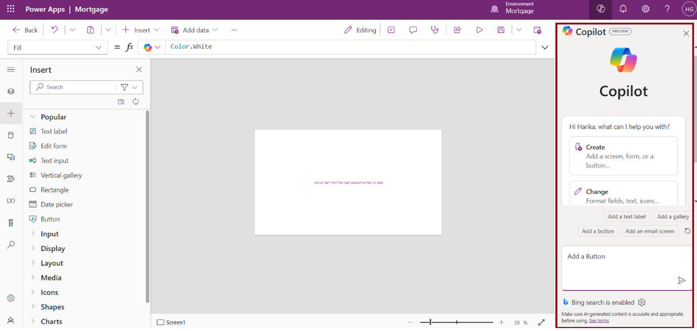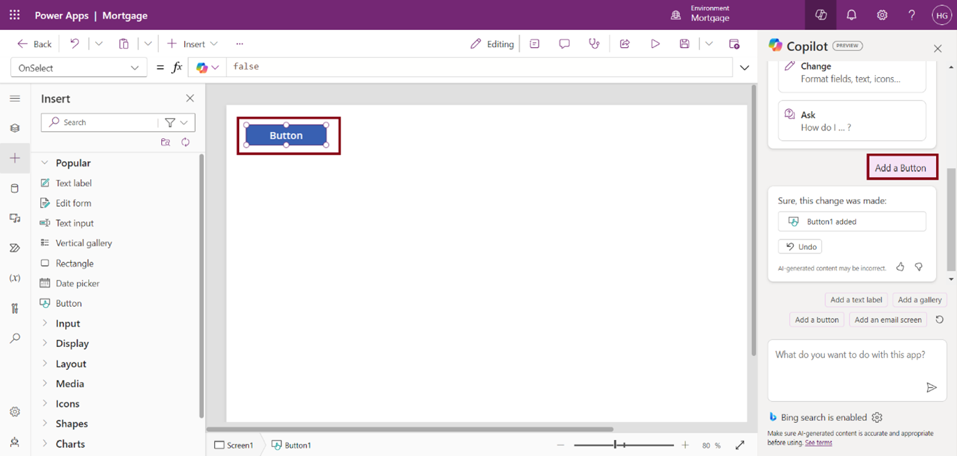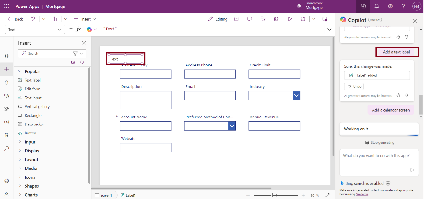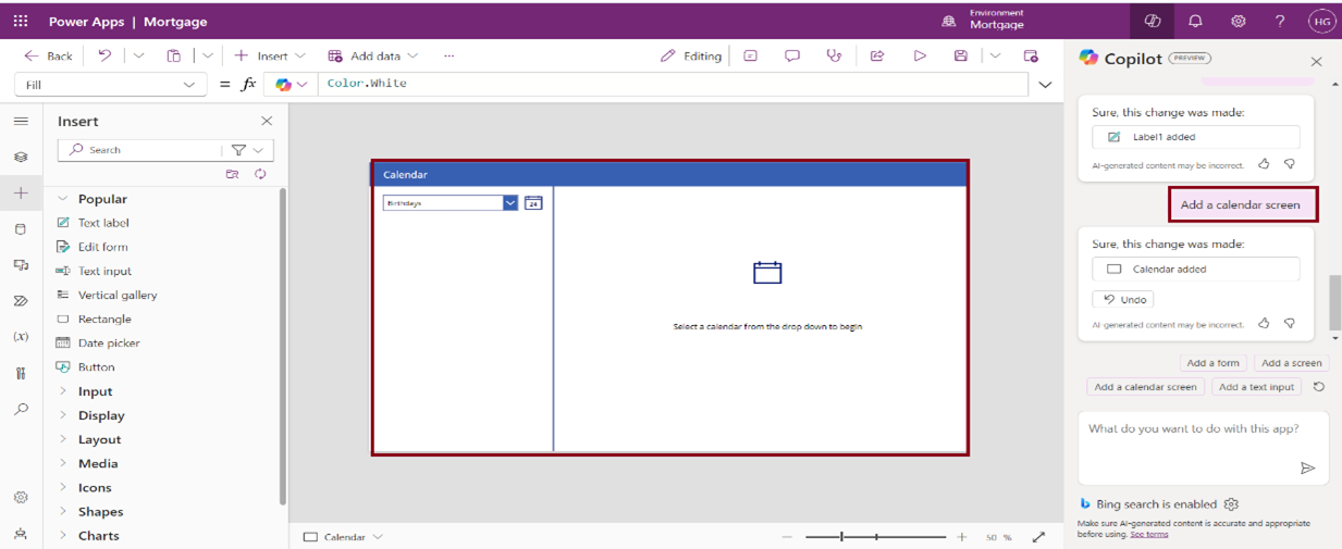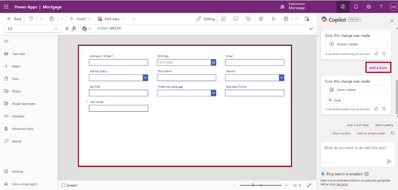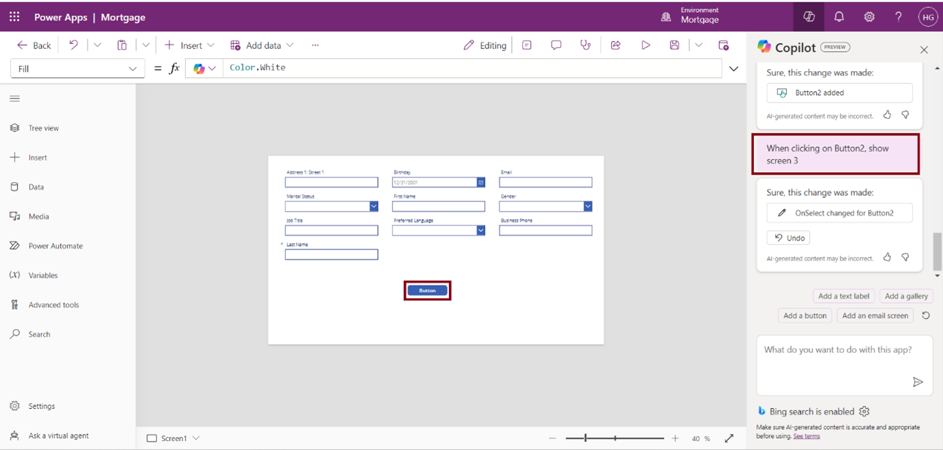 Ask Copilot to make edits, such as Add a form, button, add a text label, add a calendar screen, etc …