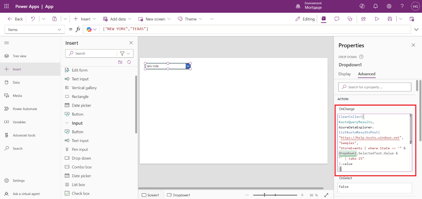 "StormEvents | where State == '" & Dropdown1.SelectedText.Value & "' | take 15"