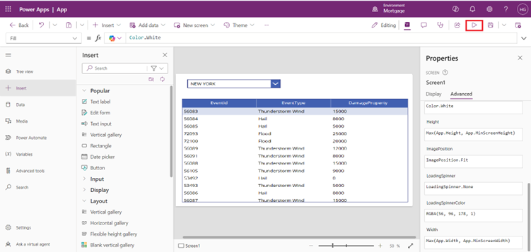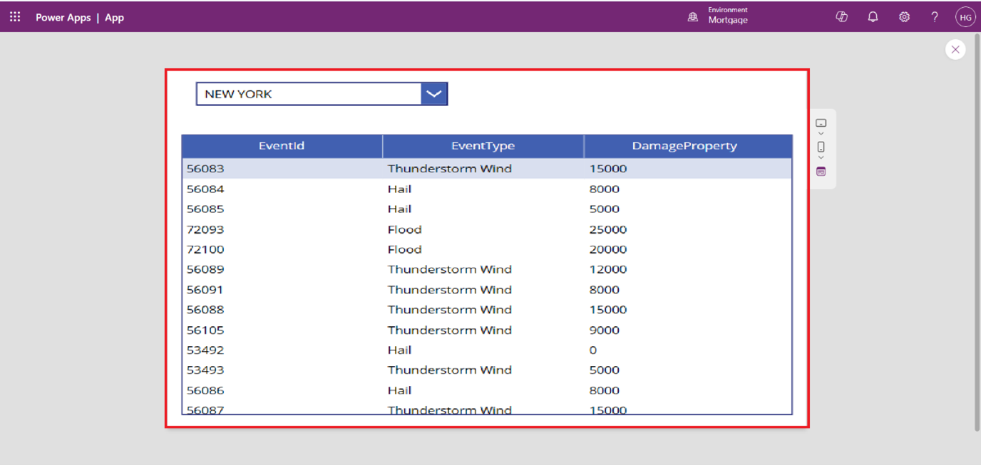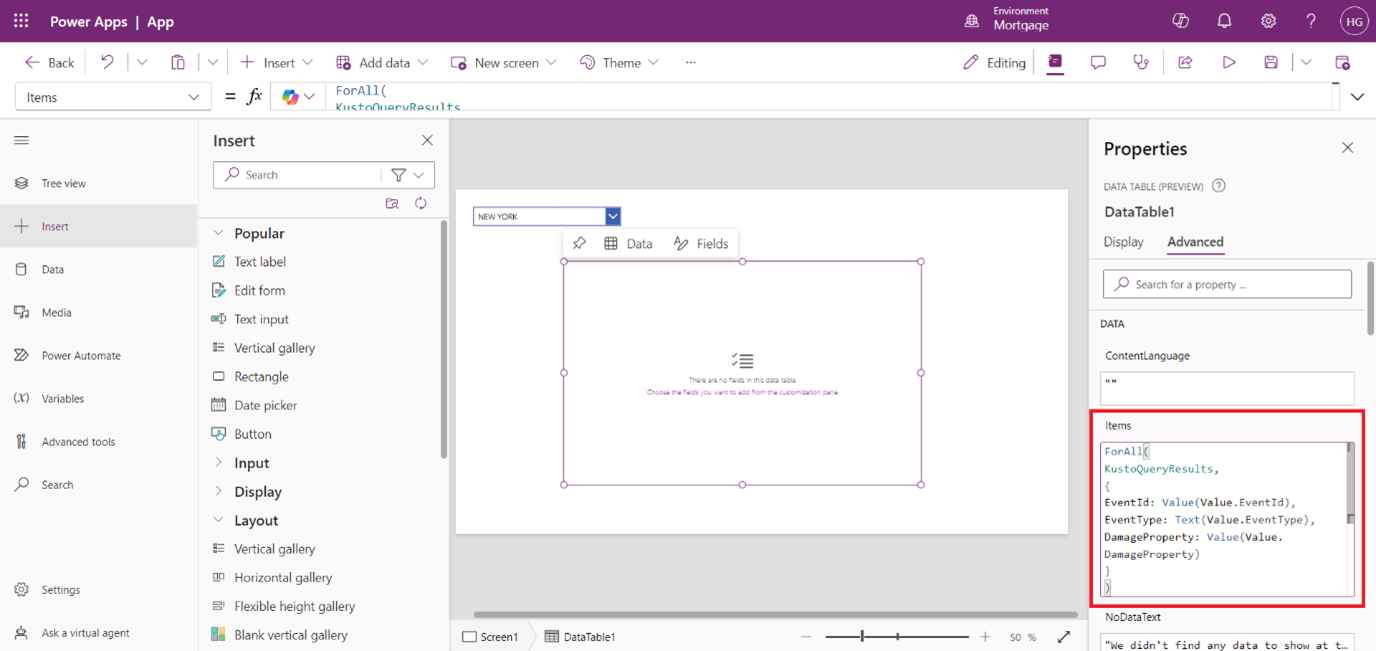 The query takes each record from the KustoQueryResults, extracts specific fields (EventId, EventType, and DamageProperty), converts them to the appropriate data types (numerical and text), and creates a new record for each entry in the results. This transformed data can then be used for further processing or display within the Power Apps application.