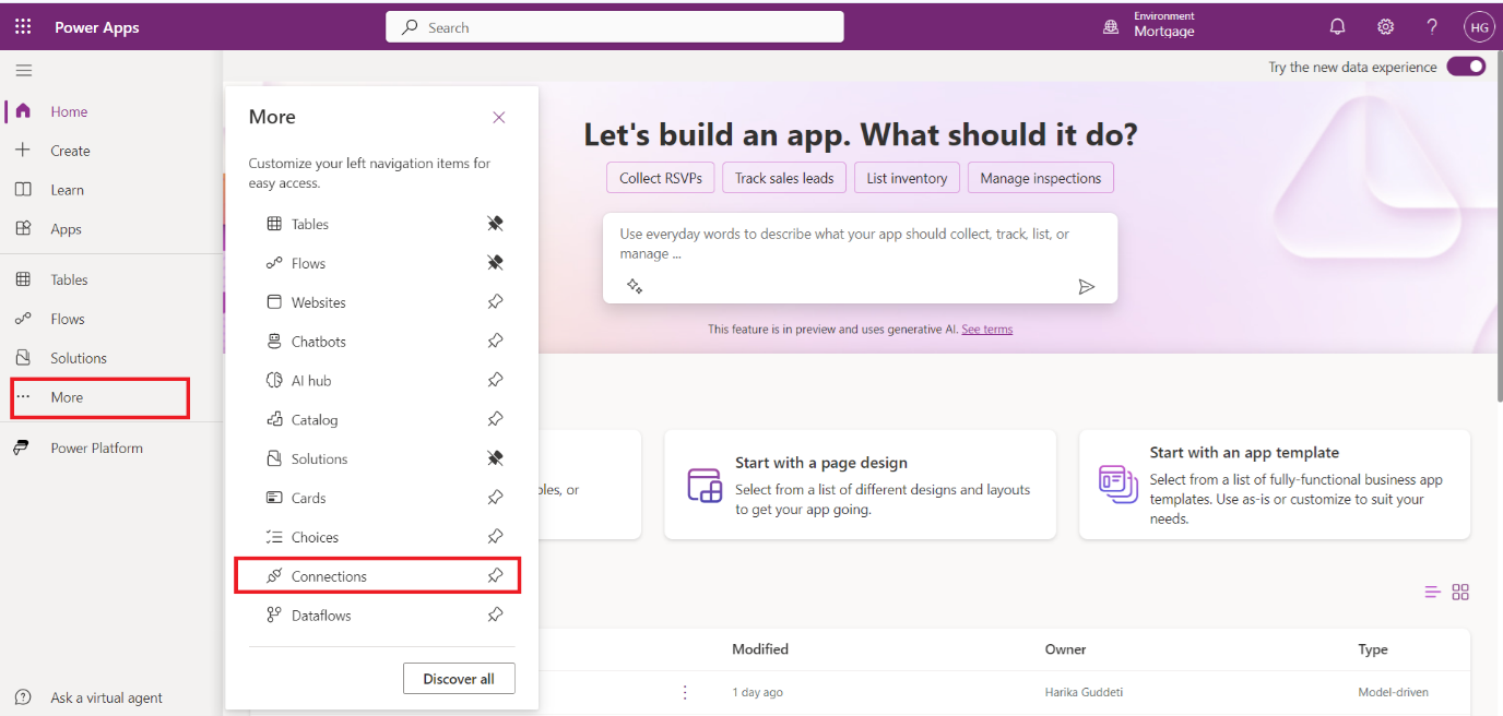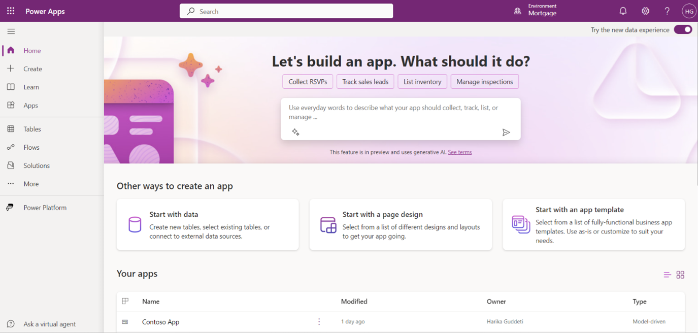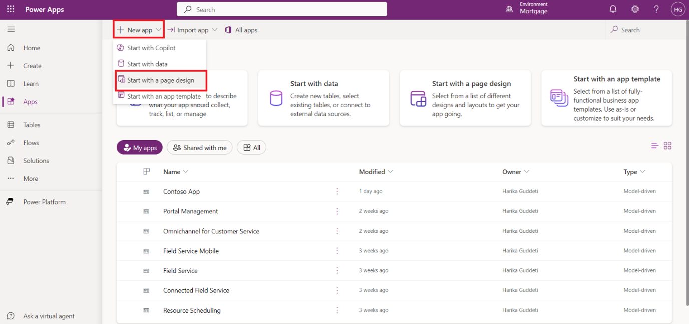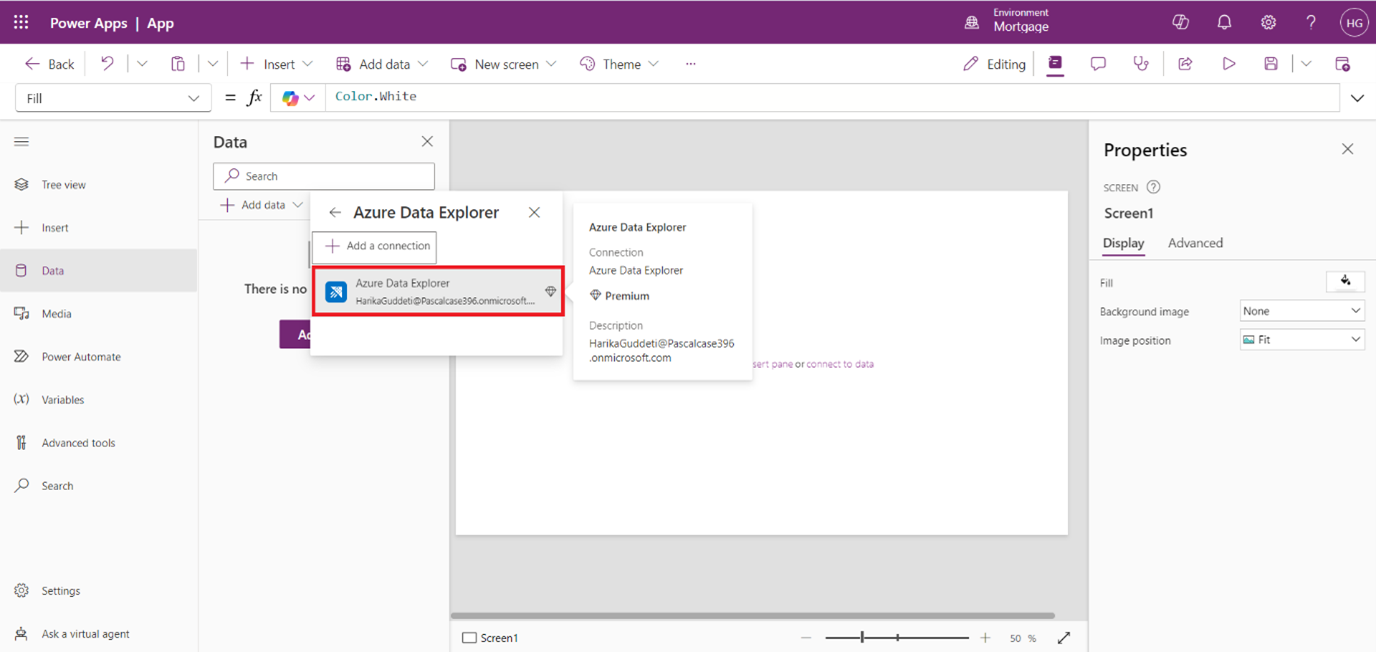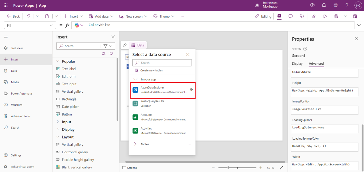 After creating the Azure Data Explorer connection, navigate to the Home tab in Power Apps Studio and create a new app with Start with a page design.