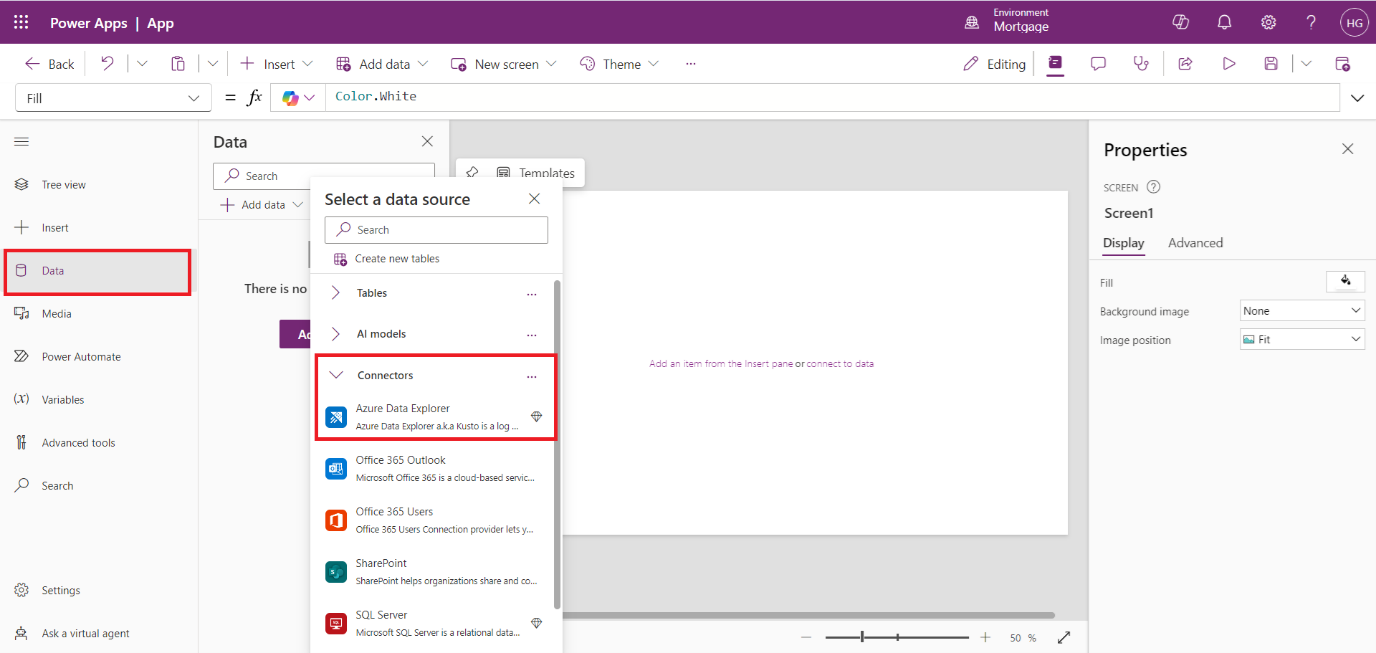 Select Connectors: In the data pane, choose Azure Data Explorer to add it as a data source.