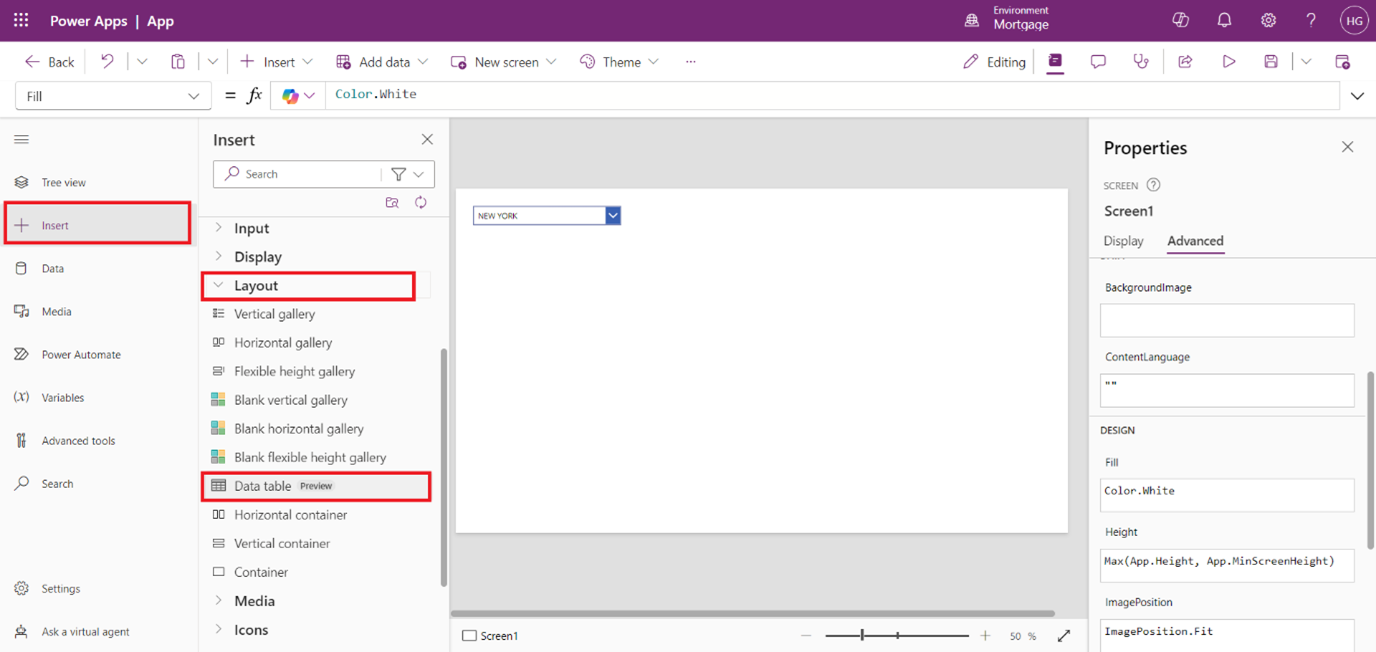 In the app editor, click on Insert, then select Layout and choose Data Table to add a data table to your canvas.