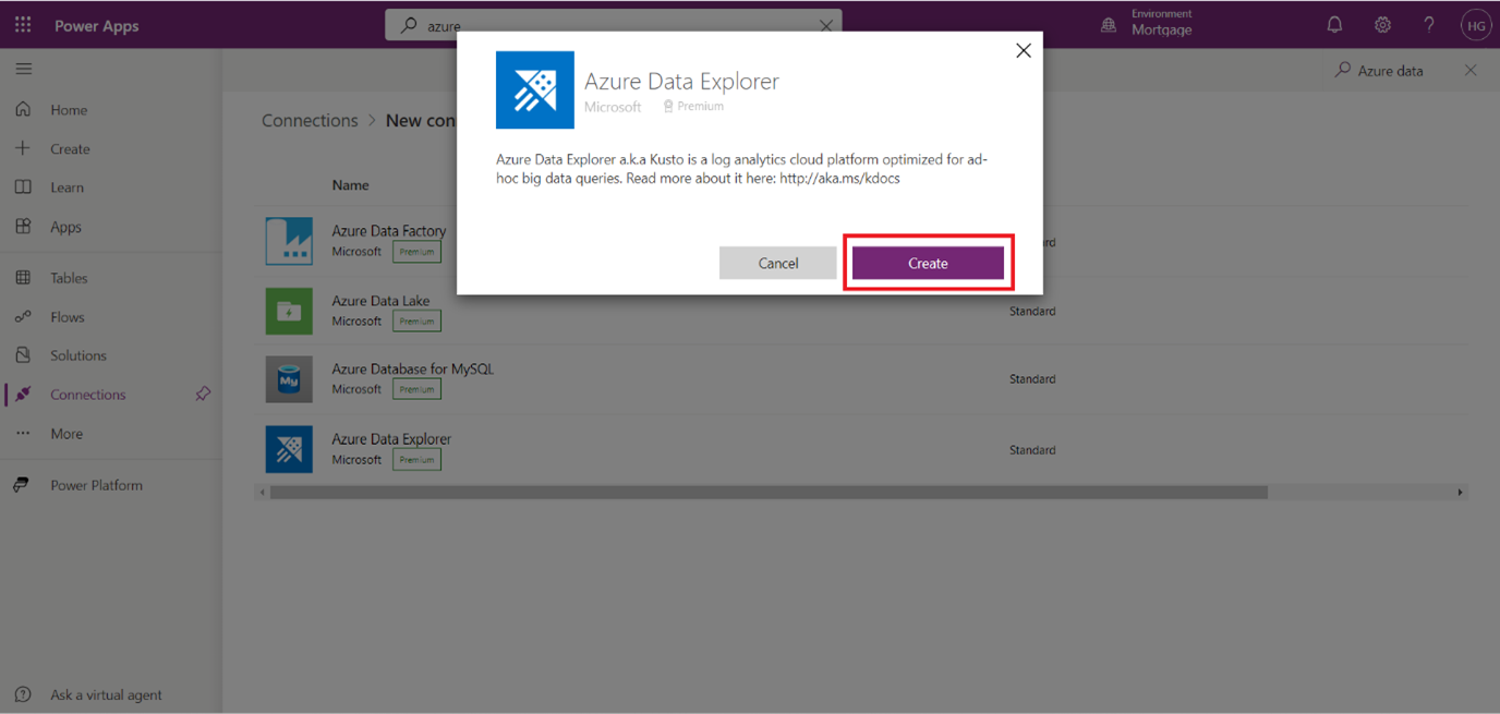 Click on the Azure Data Explorer option from the list, then click Create to begin setting up the connection.