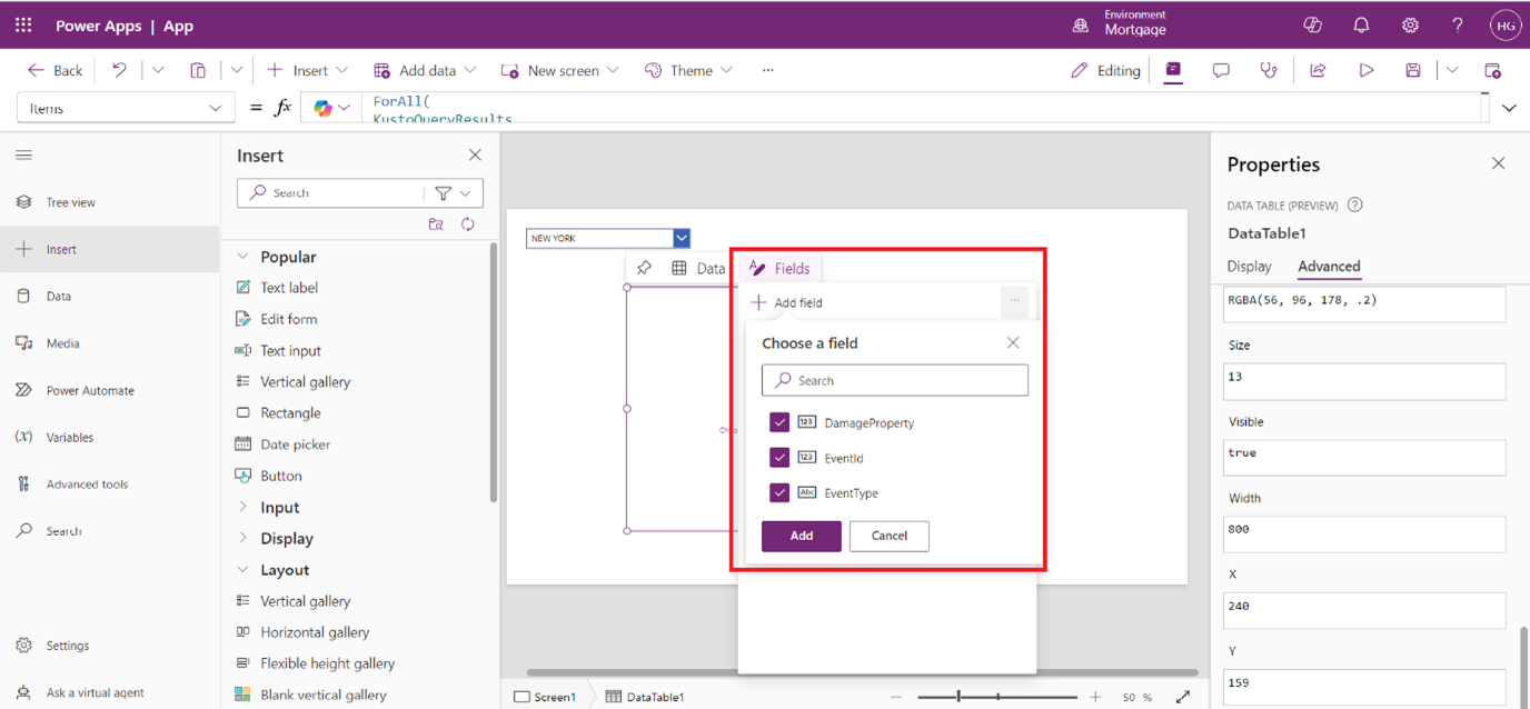 In the data table, select the Fields property and choose the fields you want to display from the Azure Data Explorer data source.