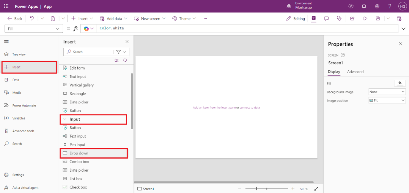 Click on Insert, then select Input and choose Dropdown to add the dropdown control to your canvas.