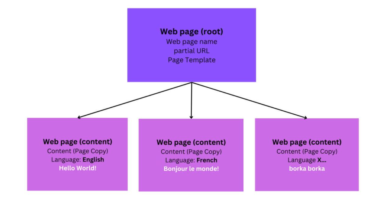A root webpage record holds important information such as the webpage name, the template it uses, the partial URL, and other related metadata. For each provisioned language in the website, there will be a corresponding webpage content record, linked to the root webpage record. The content records hold the page content for each language in the Page Copy field.