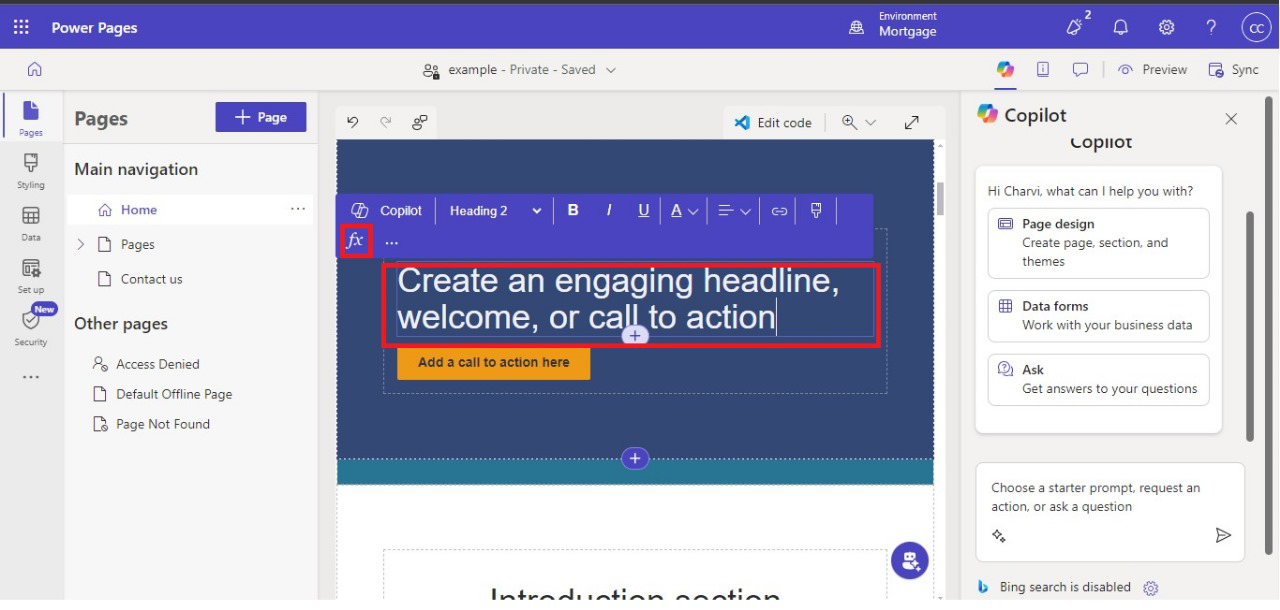 Within Power Pages, the Power Fx formula bar is a tool for writing and editing Power Fx expressions to control various page functionalities. Like the formula bar in Excel, instead of managing spreadsheet data, you handle elements of your web pages. These tasks might include displaying dynamic content, running validations, or calculating values. Let’s dive deeper into this with the help of an example.