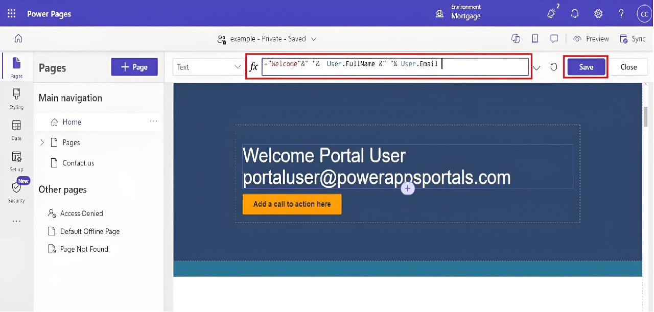 Scenario: Let's Create a welcome message on the website by showing the user's First name, Last name, and Email using Power FX formulas.