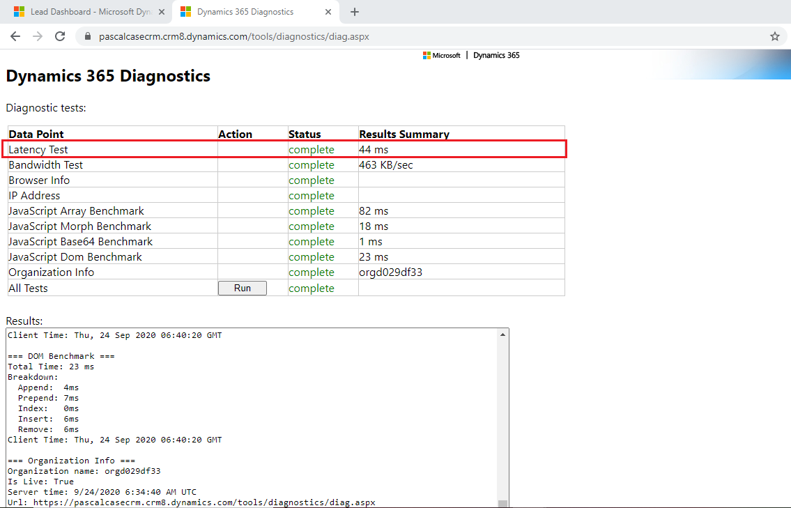 Dynamics 365 and Power Apps contain a diagnostic tool, which analyzes the connectivity of client-to-organization and generates a report.