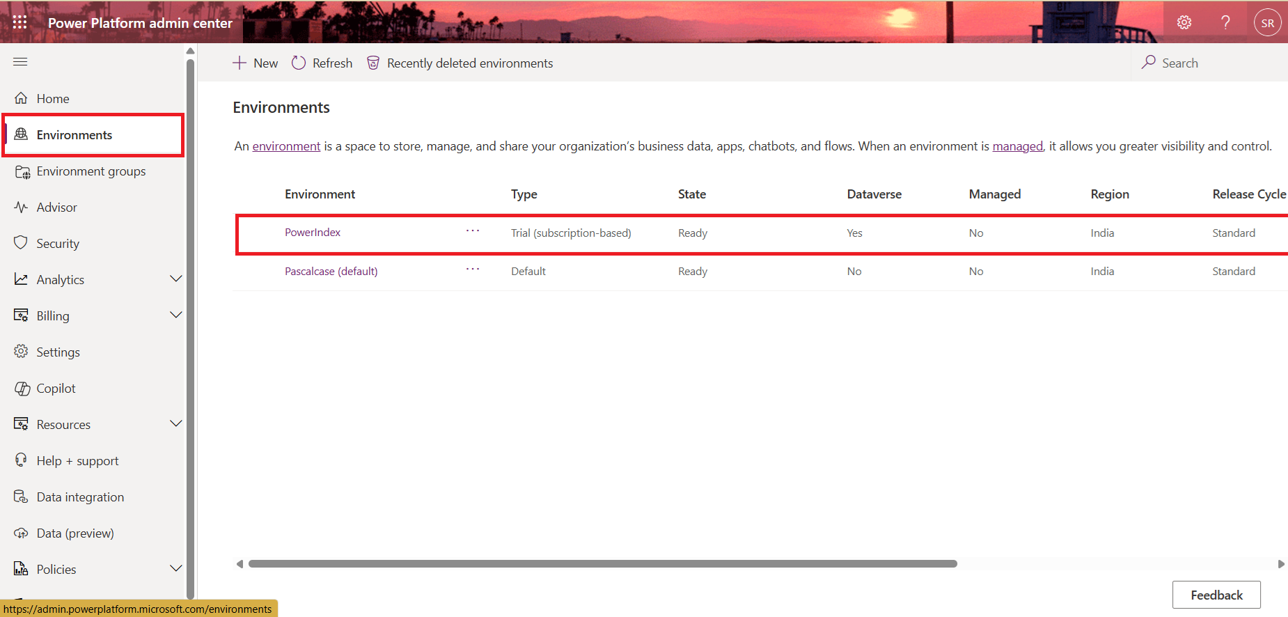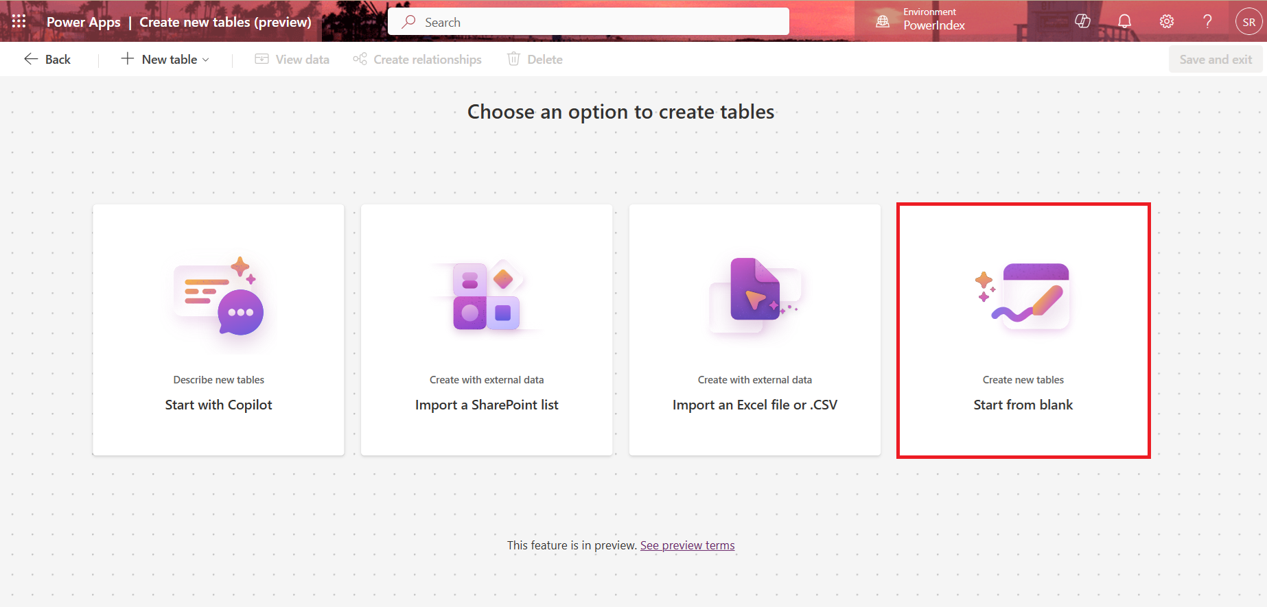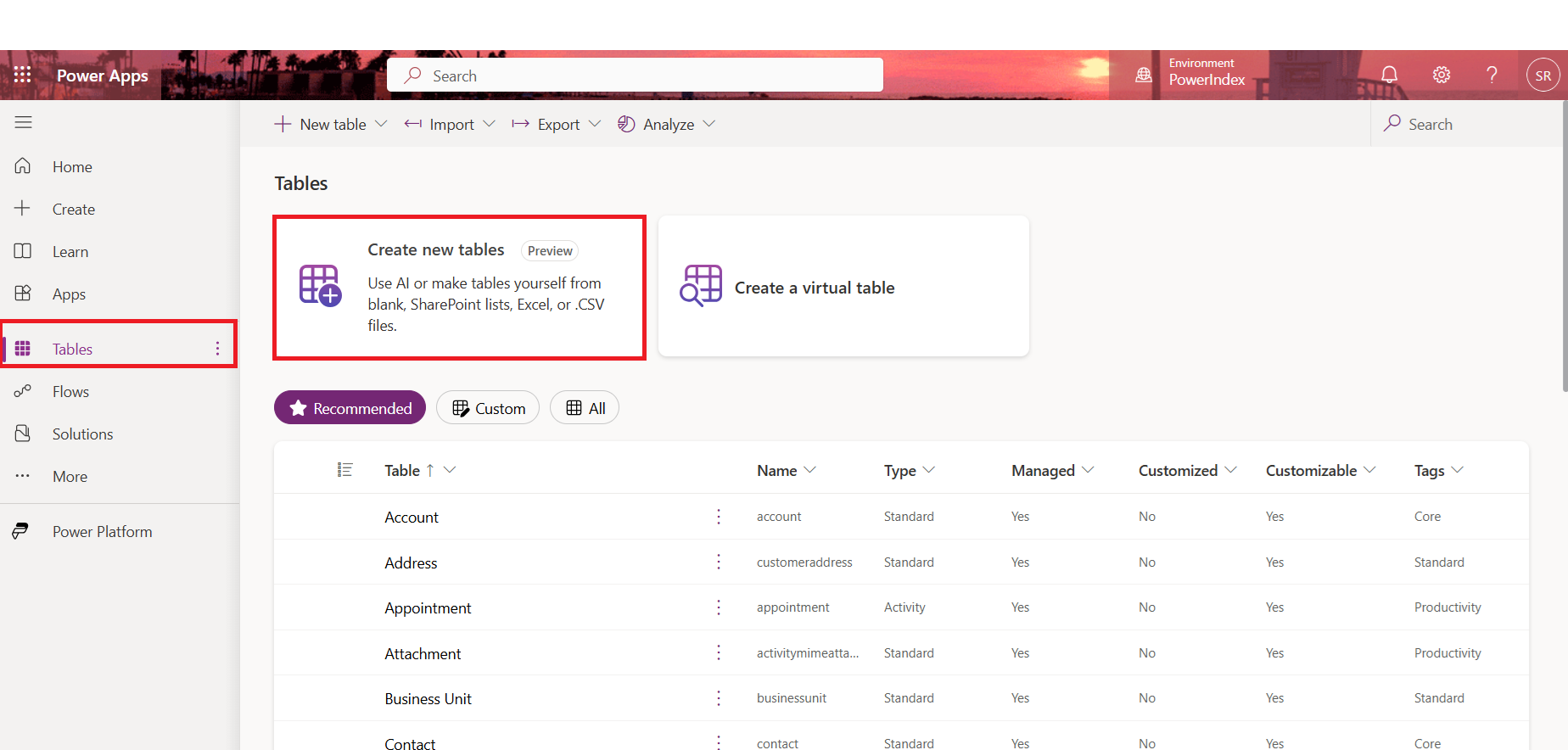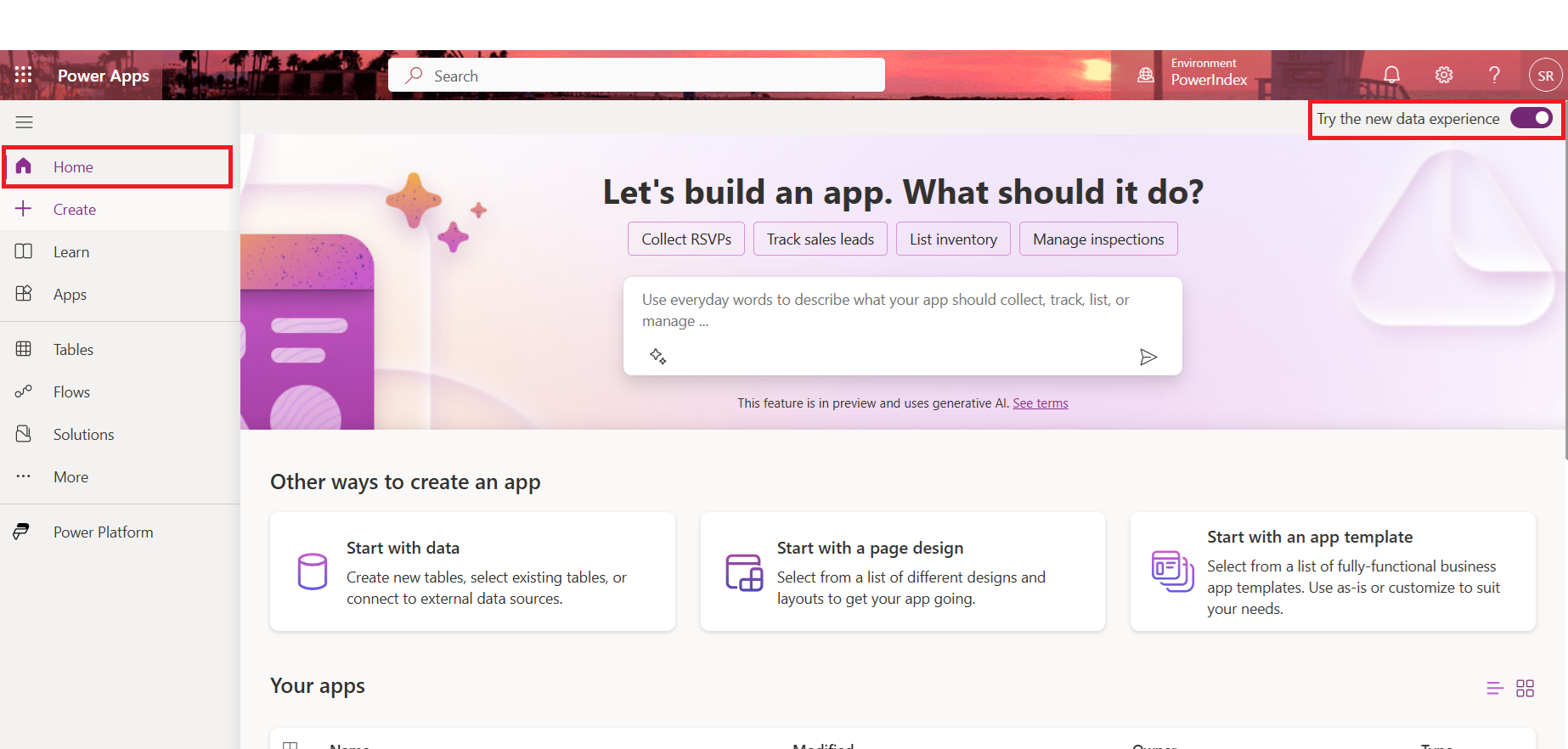 Navigate to the Power Apps Home Page for the selected environment and enable the ‘Try the new data experience’.